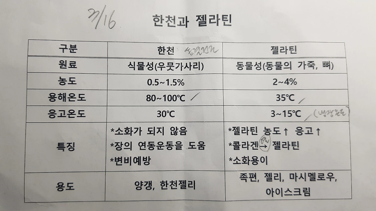친구사이에 그런 특별한 친구는 고마운 존재가 아닐 수 없다. 음식에도 그런 역할을 하는 것이 있다. 바로 '한천'과 '젤라틴'이다. 한천은 바다에서 사는 홍조류인 우뭇가사리를 동결건조해서 만든 식물성 원료이고 젤라틴은 동물의 가죽과 뼈로 만든 동물성 원료이다. 양갱, 젤리, 마시멜로우, 아이스크림 등에 응고성 원료로 한천과 젤라틴이 사용된다.
