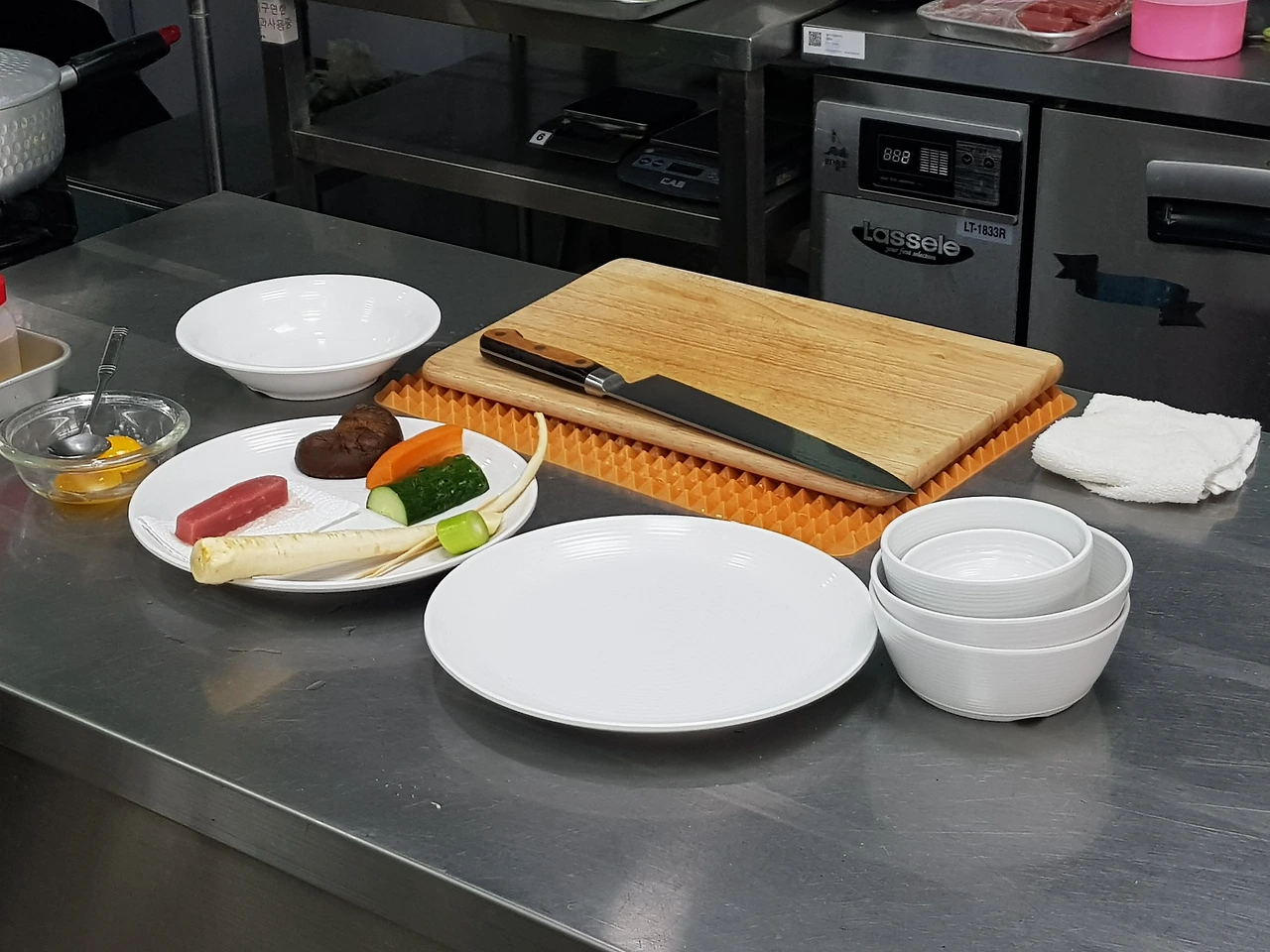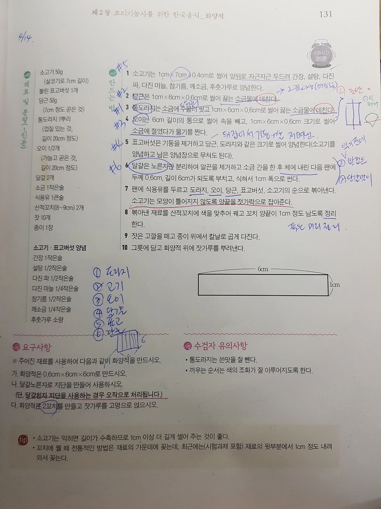 요리는 '겨데육주(겨자발효, 데칠 것, 육수 낼 것, 주재료)' 순서로 진행된다. 재료를 보니 데쳐야 할 도라지, 당근이 보인다. 데칠 재료가 보이면 냄비에 물을 올려 끓여 조리시간을 단축시켜야 한다. 도라지의 쓰고 아린맛을 제거하기 위해 그릇에 담아 소금을 뿌리고 손빨래하듯이 빡빡 문지른 후 적정한 크기(1cm x 6cm x 0.6cm)로 잘라 부드러워지도록 소금물에 담가둔다. 당근도 같은 크기로 잘라둔다.