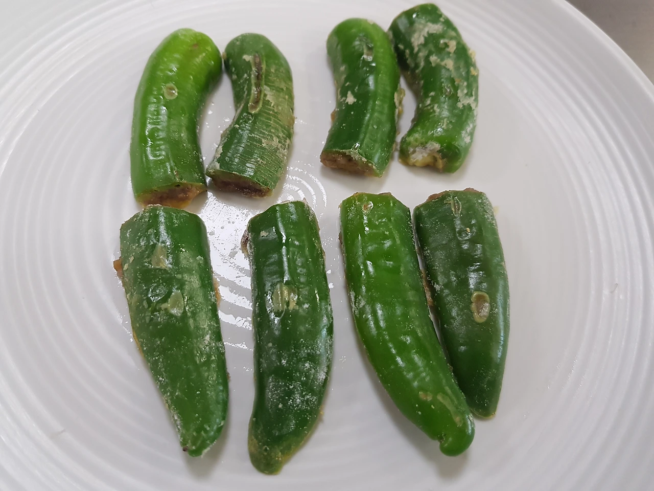 고추 안쪽에 밀가루를 묻히고 소를 편편하게 채워 넣고 옆으로 삐져나온 소는 제거하고 고추 절단면은 약간 튀어나오도록 소를 보충한다. 편편해진 면을 다시 밀가루, 달걀물을 차례로 묻힌 후 식용유를 두른 팬에 약불로 지진다음, 불을 끄고 뒤집어서 껍질 부분도 살짝 굴려서 지진다. 이때 고추를 세워 익혀내야 한다. 팬이 뜨거워 손으로 고추를 세우기가 어려워 생략하면 고기 속이 제대로 익지 않음으로 주의해야 한다.