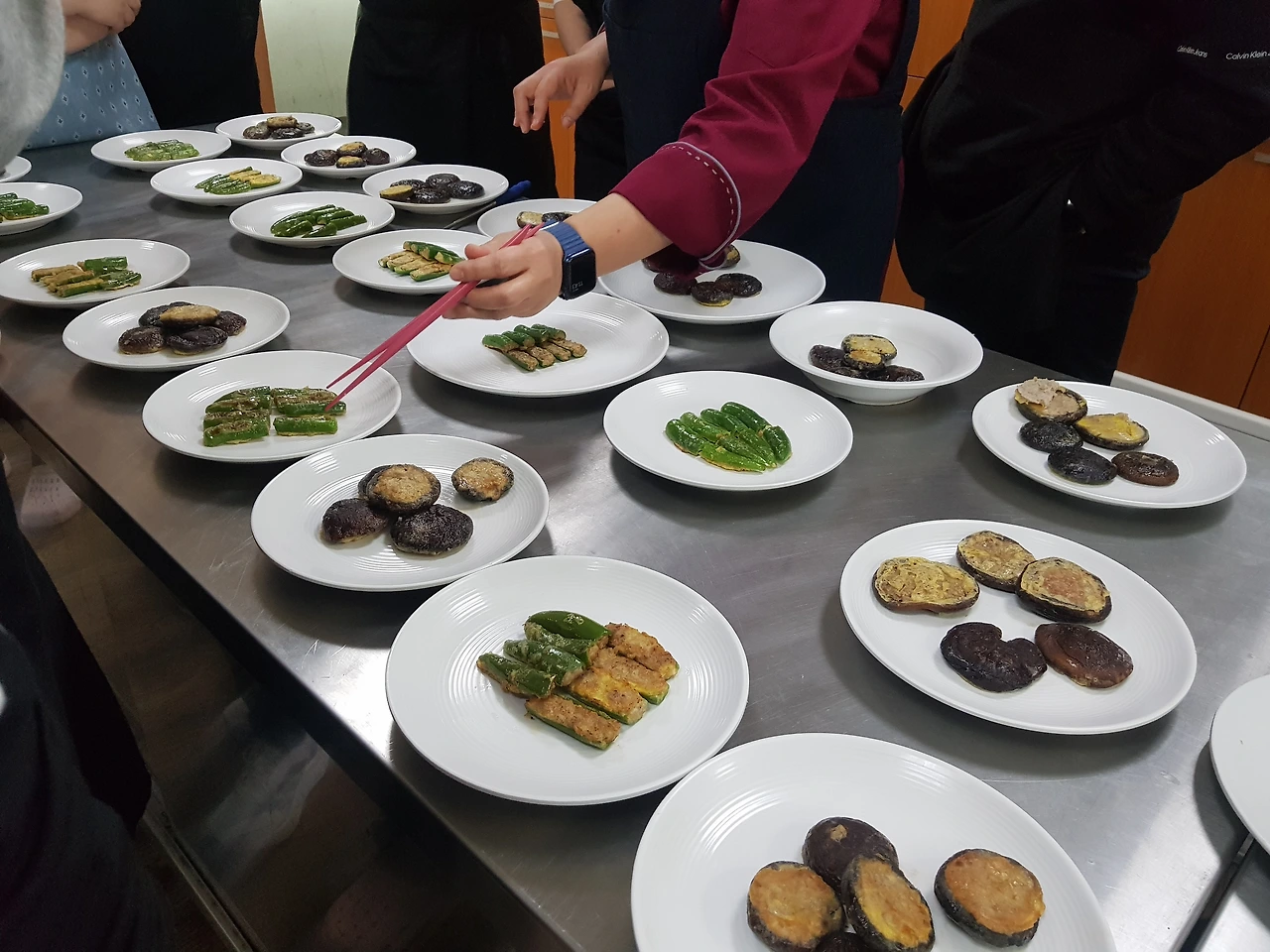 풋고추는 반을 잘라 씨를 제거하고 끓는 물에 '넣소, 뺏소'를 하며 매운맛을 빼면서 색깔 유지를 위해 살짝 데쳐준다. 고추 안쪽의 씨가 붙어있던 줄기는 제거하지 않고 그대로 둔다. 나중에 고기 속이 고추와 이탈되지 않고 고정되게 하는 역할을 해주기 때문이다. 소고기를 다지고 두부를 으깨서 간장 대신 소금으로 불고기 양념(소설파마 후깨참)을 해서 잘 치대 준다.
