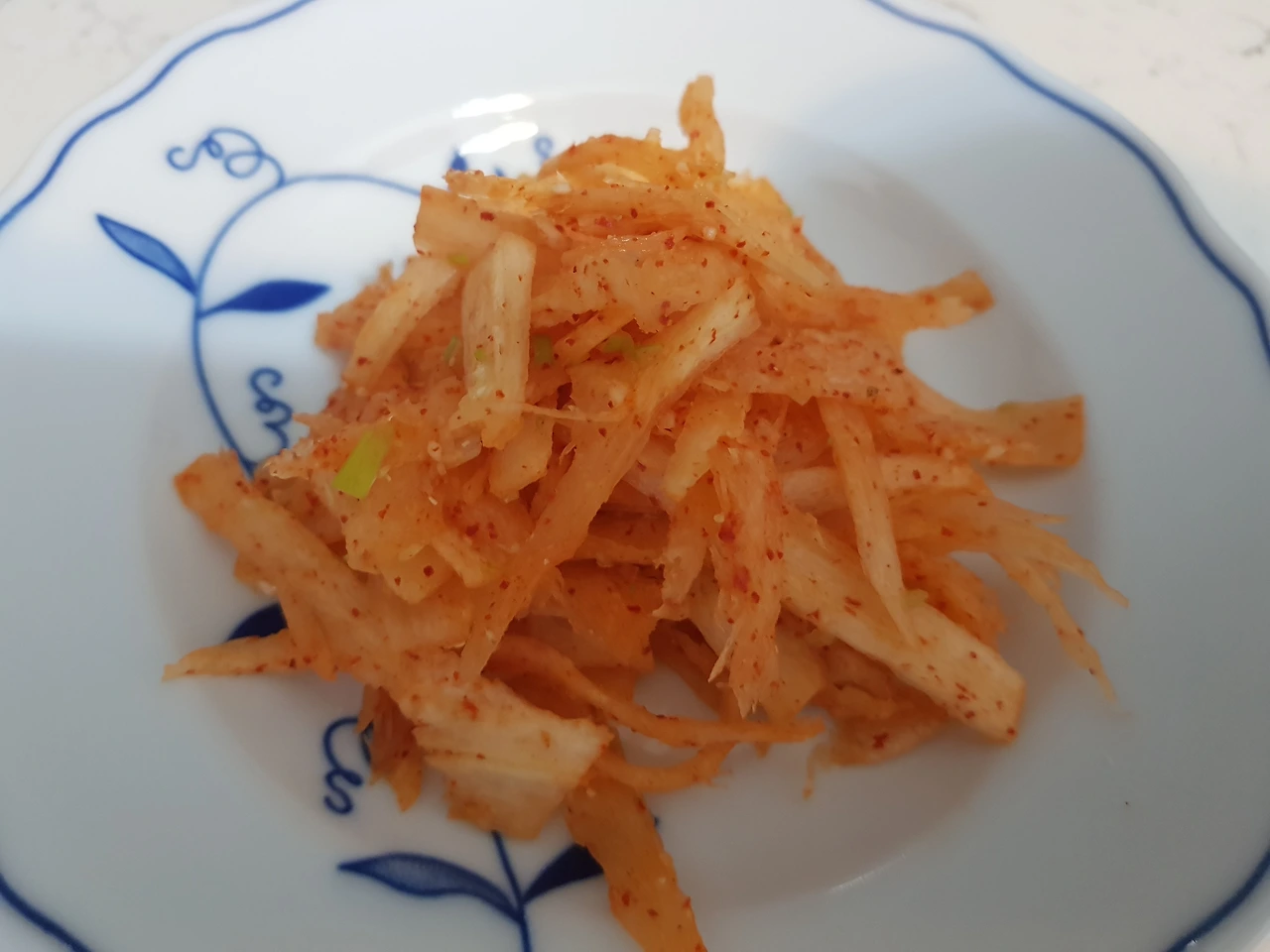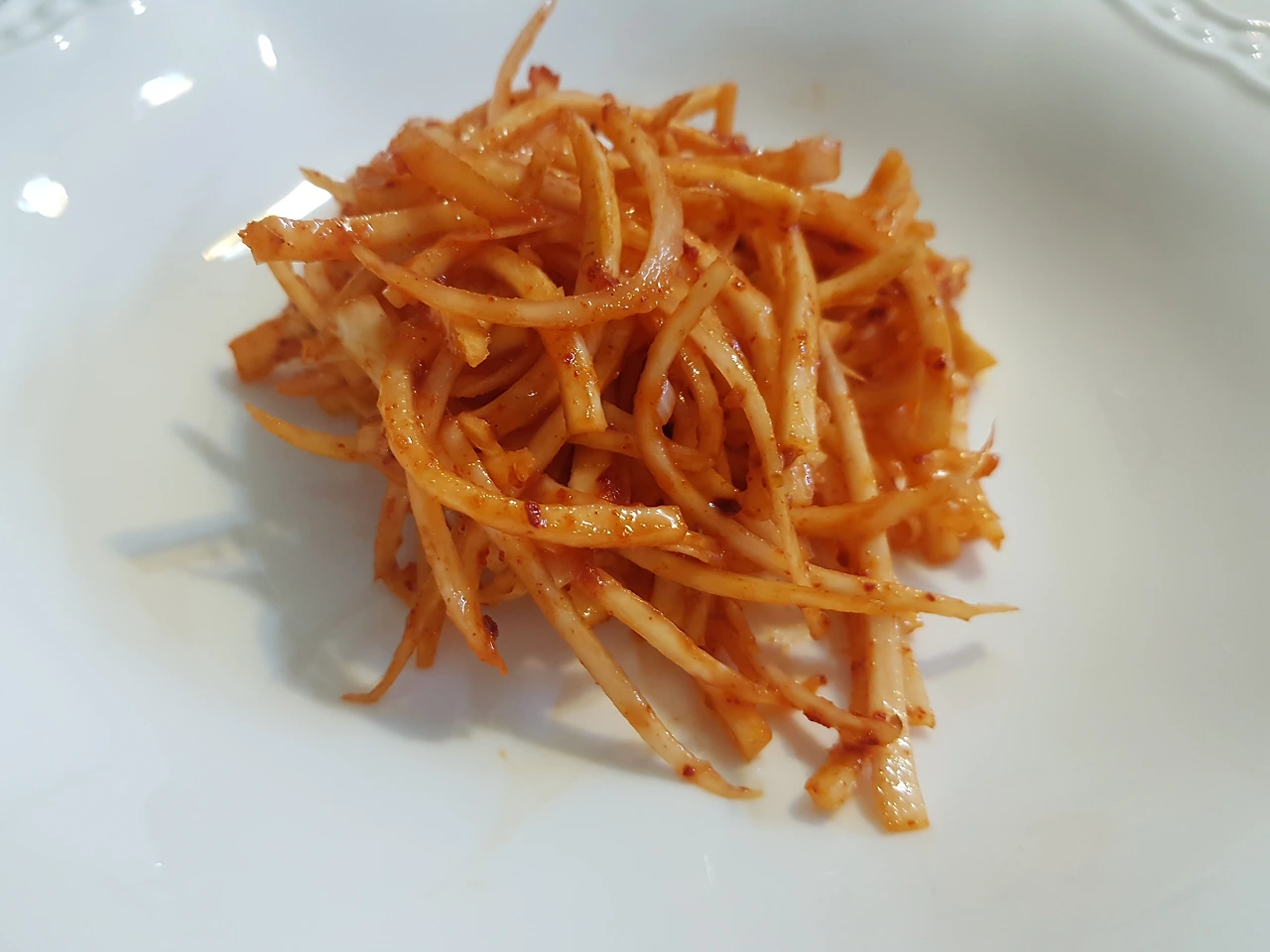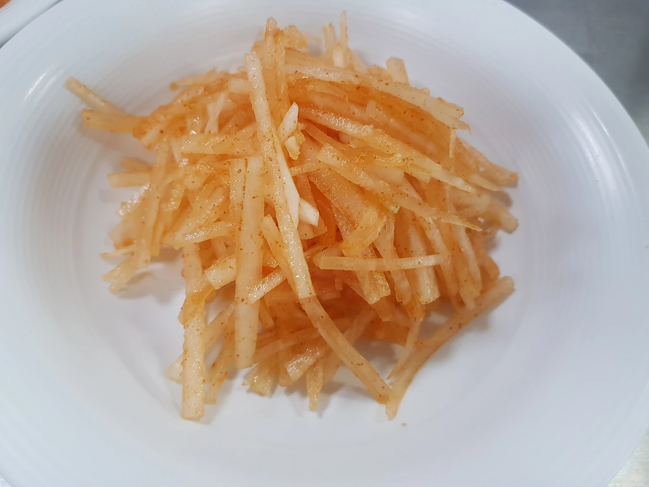 이때 너무 세게 문지르지 않고 조물조물 무쳐낸다. 채 썬 무가 약하기 때문에 세게 무치면 부서지기 때문이다. 물들인 무채에 양념장은 다른 생채와 마찬가지로 '파마 설식 깨소'로 한다. 양념을 무친 후에 완성그릇에 담아내면 끝인데, 혹시라도 집에서 처럼 깨를 고명으로 올리듯이 습관적으로 시험장에서 올리면 안 된다.