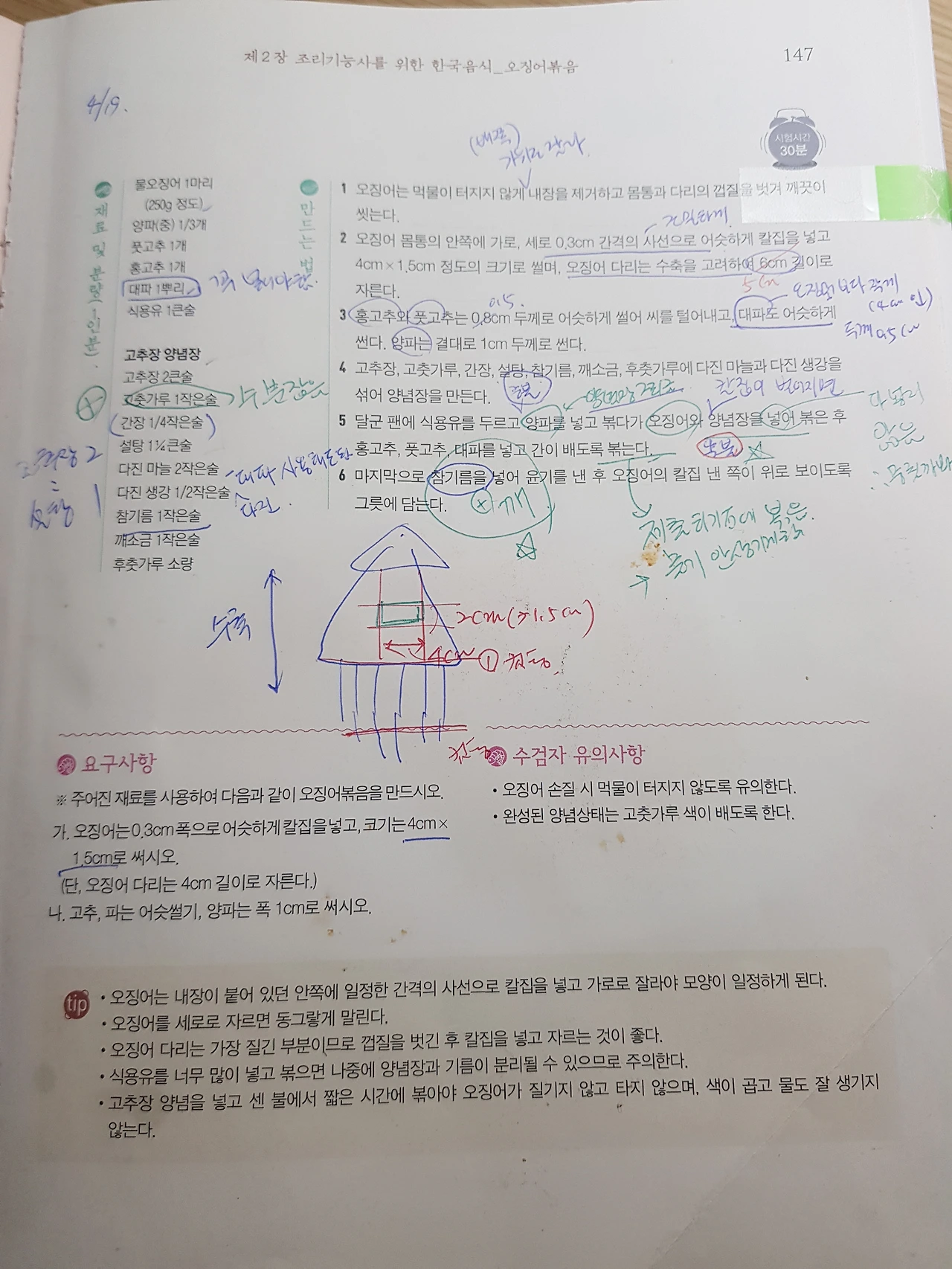 한식조리 기능사 '오징어 볶음' 과제의 요구사항은 두가지 이다. '첫째, 오징어는 0.3cm 폭으로 어슷하게 칼집을 넣고, 크기는 4cm x 1.5cm로 썰기. 둘째, 고추, 파는 어슷썰기, 양파는 폭 1cm로 썰기' 이다. 요구사항이 많지는 않지만 가장 중요하면서도 주의를 요하는 것이 '칼집 넣기' 이다.
