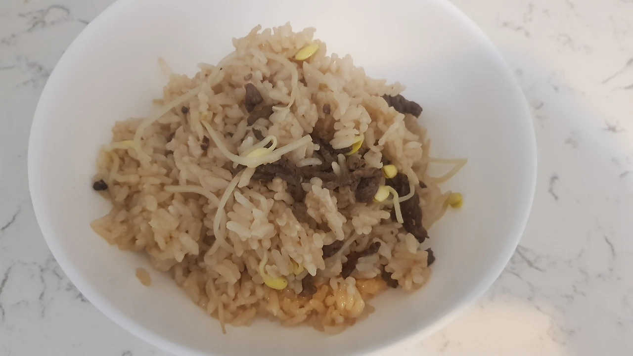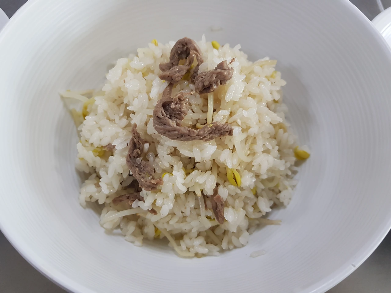 불린 쌀은 물기를 빼고 조리컵으로 양을 재고 동량의 물의 개량하고 거기서 두 큰 수저 정도의 물을 빼고 준비한다. 냄비에 불린 쌀을 넣고 깨끗이 손질한 콩나물을 밥 위에 올려주고 그 위에 양념한 소고기를 뭉치지 않게 분산시켜 올려준다. 이때 소고기는 결대로 곱게 썰어서 살짝 유장처리하고 파와 마늘을 넣는다. 평소 다른 요리에서처럼 불고기 양념을 하면 절대로 안된다. 밥에 설탕, 후추, 깨소금이 들어가면 안 되기 때문이다.