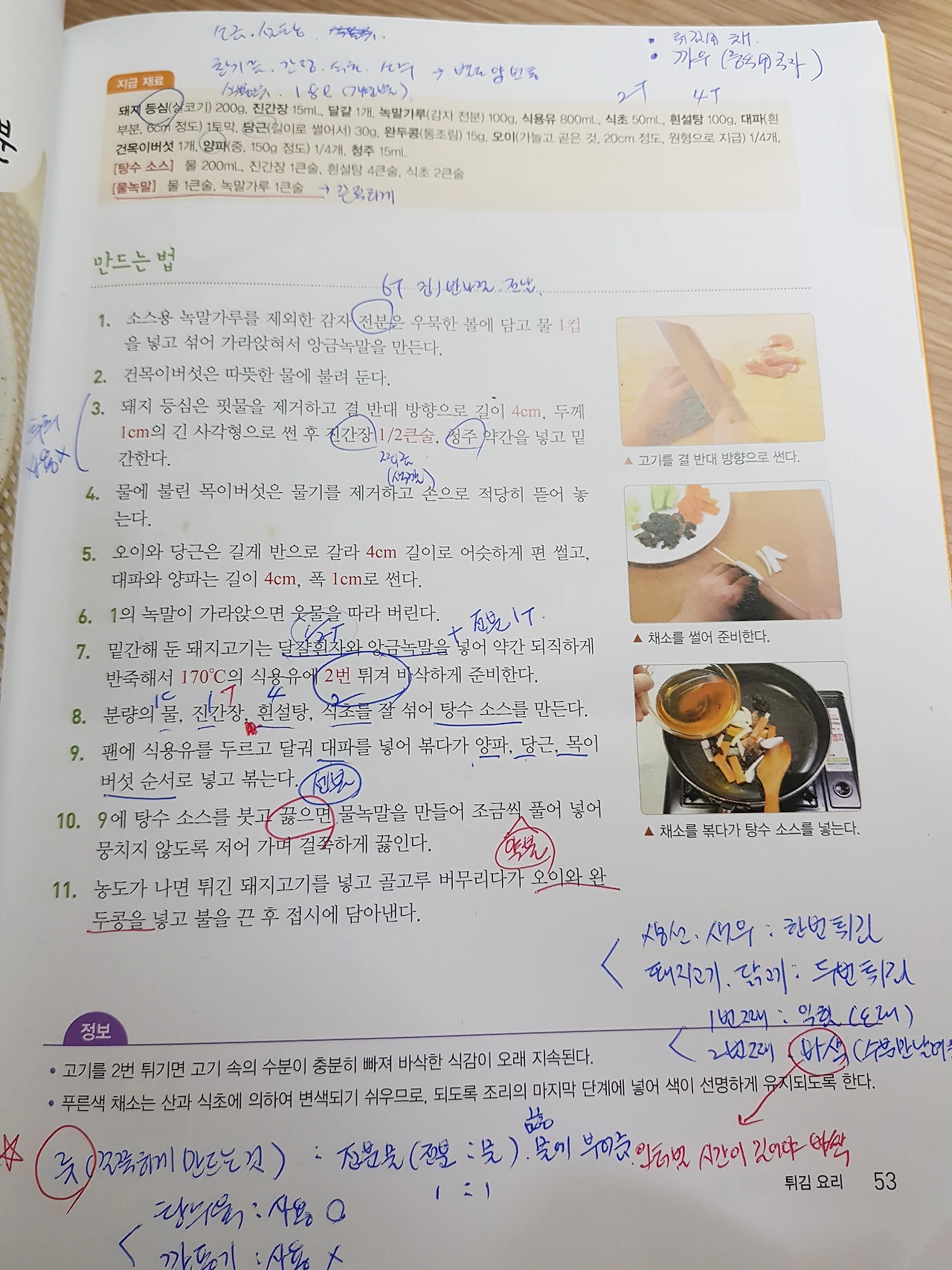 돼지고기 밑간은 진간장, 청주로 하고 달걀흰자(1/2T), 앙금녹말(6T)을 넣어 되직하게 반죽해서 2번 튀겨낸다. 첫 번째와 두 번째 튀기는 시간이 늘어날수록 더 바삭해진다. 한식에서는 좀처럼 사용하지 않던 녹말(감자 전분가루)이 등장했다. 앙금녹말은 녹말을 물에 섞어 가라앉는 전분덩어리를 말한다. 앙금녹말은 일반녹말을 사용하는 것보다 '겉바속촉'을 만들어 준다.