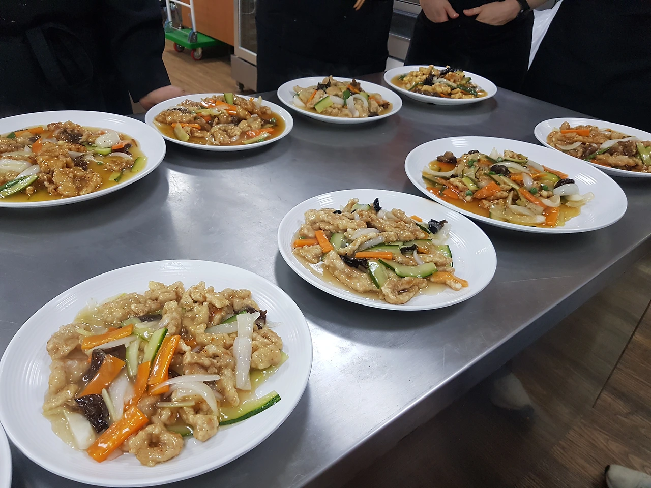조리사부의 시범 이후에 각자 자리에서 중식도를 처음 잡고 야채를 썰어본다. 칼이 묵직하다. 한식에서는 칼끝으로 세밀하게 자르던 마늘도 중식에서는 '툭 툭 툭' 뒷날로 쳐내린다. 야채(오이, 당근, 대파)와 돼지고기도 숭덩숭덩 잘라서 접시에 담긴다.