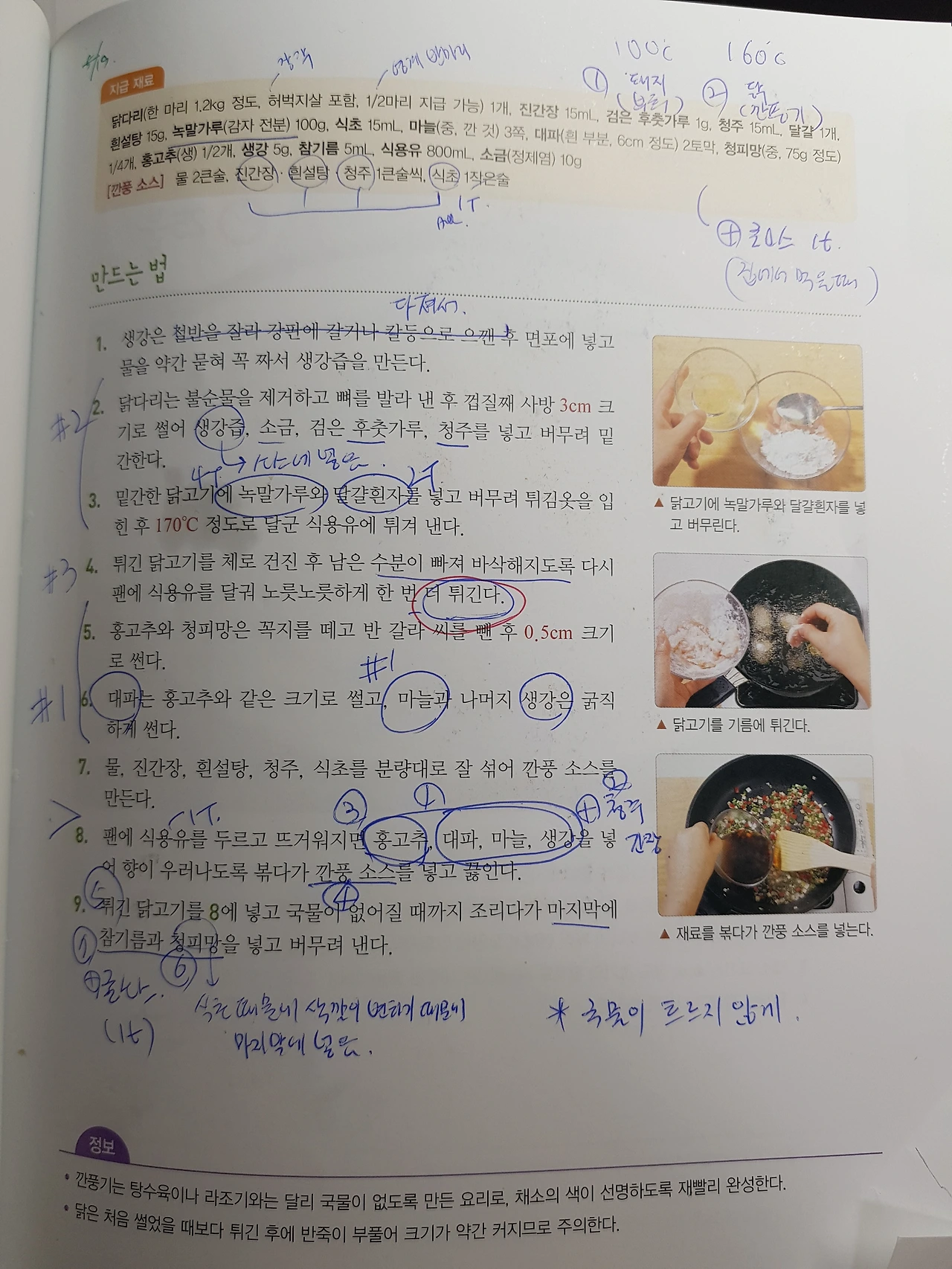 중식실기 책으로 만드는 법을 설명 듣고, 요리사부의 시범을 메모를 하면서 꼼꼼히 보면서 머릿속으로 순서를 정리하고 각자 요리를 만든다. 3개월 정도 한식수업을 받아서 그런지 중식수업도 같은 방식으로 진행이 되어 수업자체는 익숙한 루틴으로 진행이 된다.