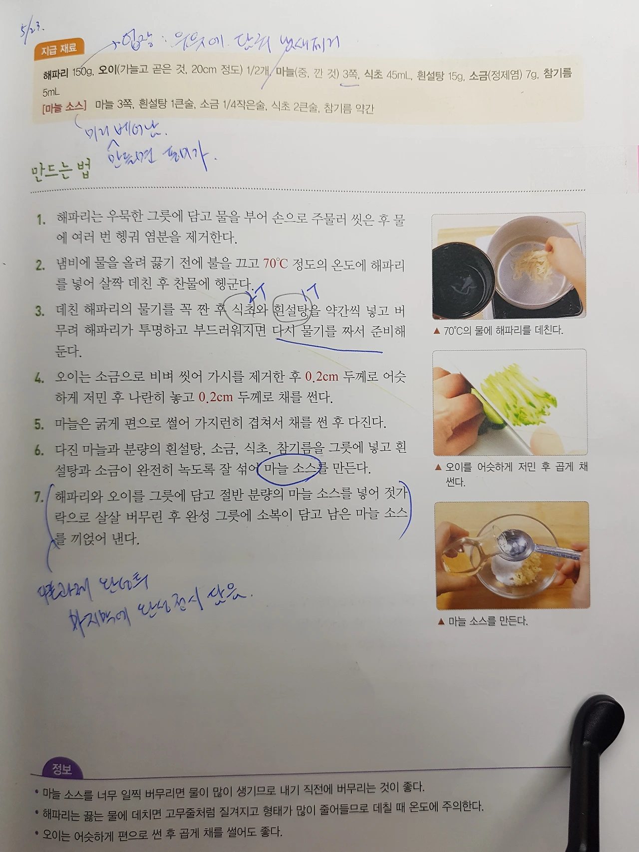 잠시 물에 담가두었다가 냄비에 물을 올리고 끓기 전 김이 올라올 정도(70도)에 해파리를 살짝 데친 후에 찬물로 헹군다. 너무 뜨거운 물에 데치면 고무줄처럼 딱딱해질 수 있음으로 주의해야 한다. 데친 해파리는 식초(1T)와 흰 설탕(1T)에 버무려 부드러워지면 물기를 짜내고 별도로 그릇에 담아둔다.