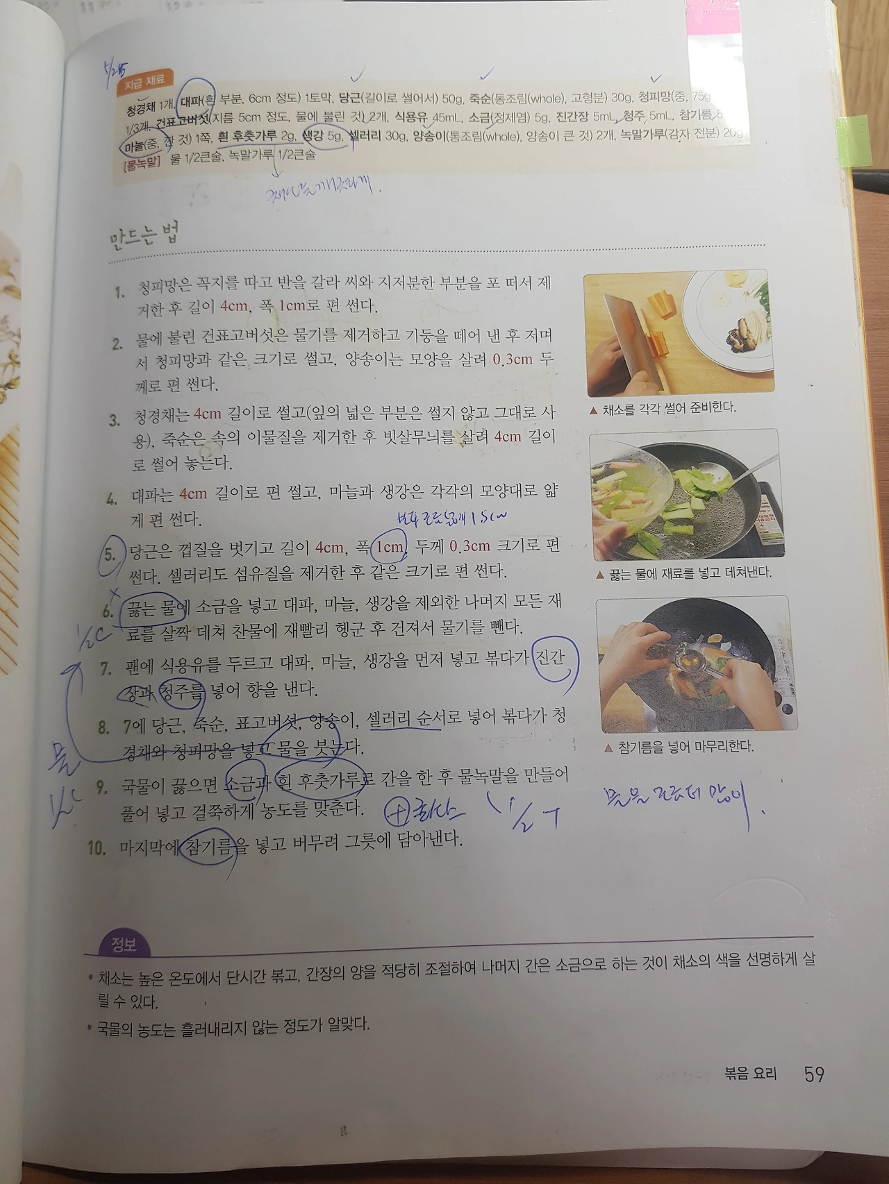 모든 채소는 4cm 정도의 편으로 썰고 대파, 마늘, 생강을 제외한 모든 채소는 끓는 물에 살짝 데쳐서 사용하라는 것이 요구사항이다. 물에 데치면 색깔이 더 진해지고 부드러워진다. 야채 손질 전에 양송이과 죽순은 통조림 제품인 경우에는 별도로 물에 데쳐서 불순물을 제거한다.