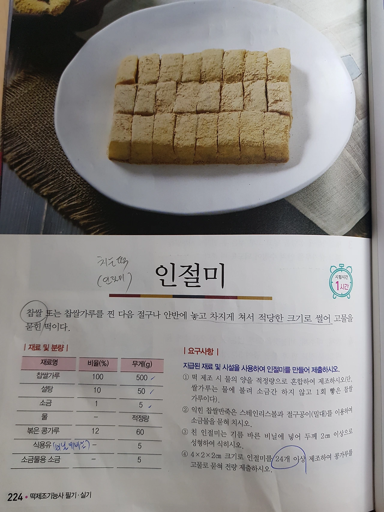찹쌀가루 500그램으로 24개의 인절미를 만드는 것이 떡 제조기능사의 1시간짜리 과제이다. 찹쌀가루에 소금(찹쌀가루의 1%, 5그램)과 물(2큰술)을 넣고 손으로 충분히 비벼서 습기가 골고루 섞이게 한 다음 설탕(찹쌀가루의 10%, 50그램)을 섞어준다. 찜기에 젖은 면포를 깔고 나중에 반죽이 잘 떨어지게 설탕을 바닥에 골고루 뿌려준다. 찹쌀가루를 한주먹씩 살짝 쥐어 면포 위에 올리고 30분 정도 찐다.