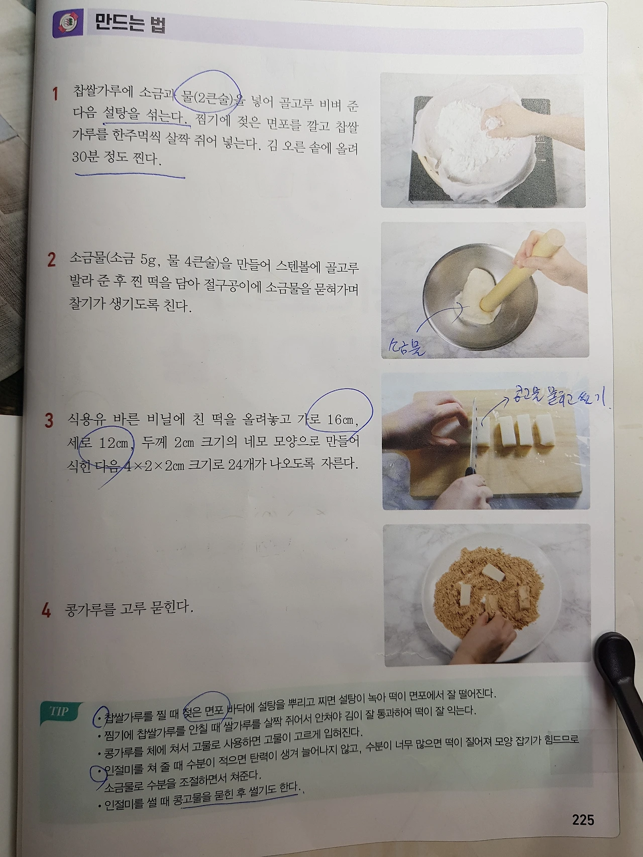 쪄낸 반죽은 소금물(소금 5그램, 물 4큰술)을 골고루 바른 스텐볼에 담아 절구공이로 반죽이 꽈리모양이 될 때까지 친다. 어느 정도 찰기가 생기면 식용유를 바른 비닐에 올려 사각형 모양(16cm x 12cm x 2cm)을 잡고 찬 행주를 감싸 열기를 식혀준다. 도마에 콩고물을 뿌리고 칼이나 스크리퍼로 24등분으로 동일크기로 자르고 콩고물을 골고루 묻혀서 완성접시에 담아내면 끝이다. 접시가 작아 인절미가 넘친다.