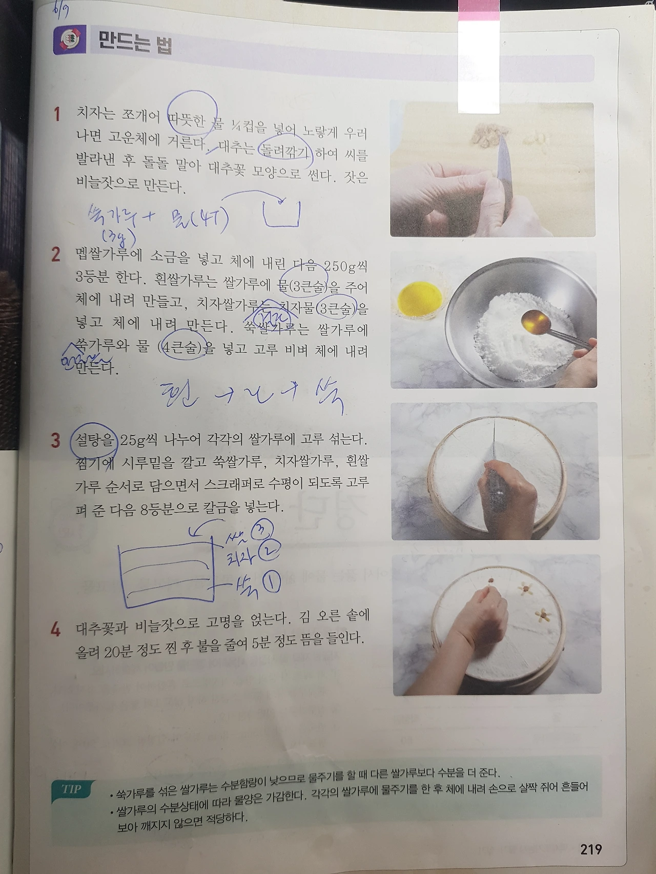 무지개떡은 맵쌀가루를 여러 가지 색으로 물들여 찜기에 쪄서 만들며 '색떡'이라고도 한다. 떡 필기시험 공부할 때 떡에 색을 만드는 재료들을 공부하기는 했지만 노란색을 물들이는 말린 '치자열매'를 본 건 처음이다. 살짝 빠아서 물을 부으니 바로 노란색 물감을 타놓은 듯한 색으로 변한다. 쑥이 들어간 쑥떡은 가끔 상계동 본가에 가면 어머님이 동네 떡집에서 하나 가득 사서 집에 갈 때 주시는 단골 선물이다 보니 익숙하다.