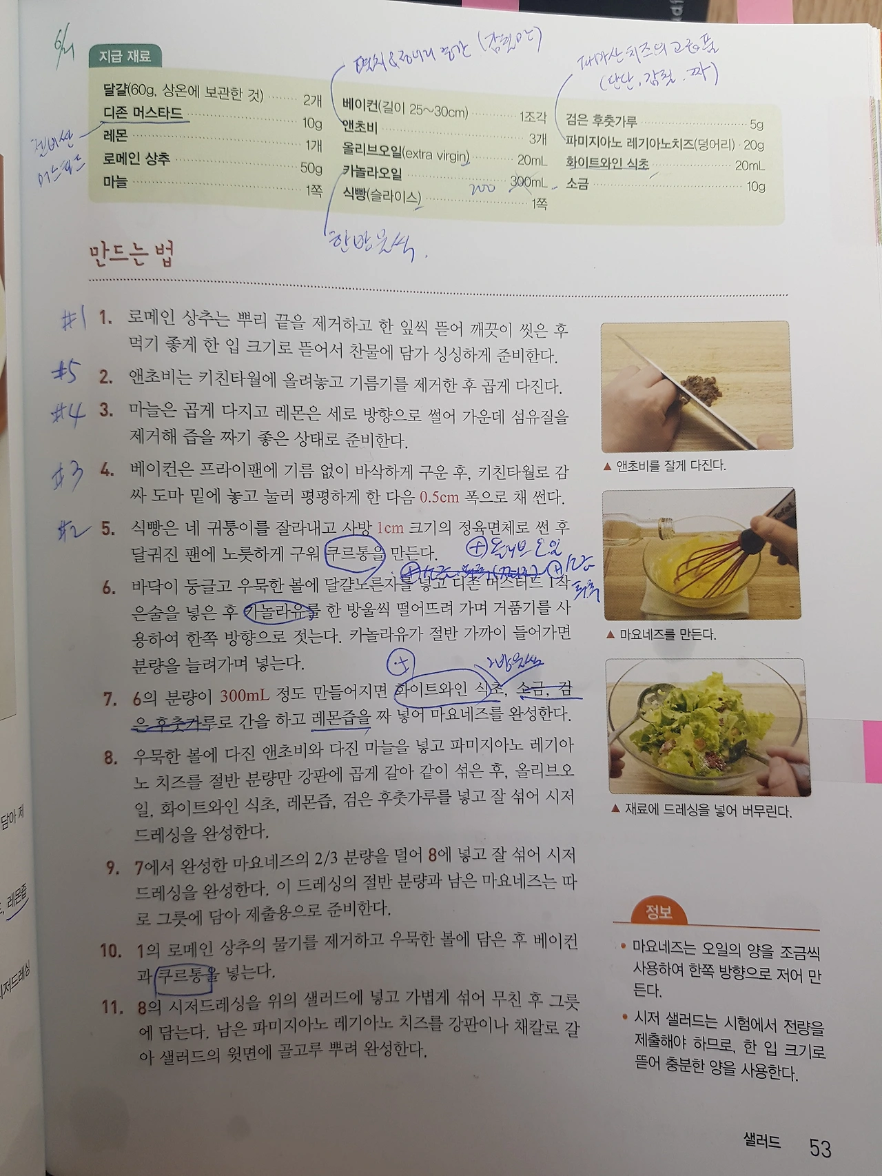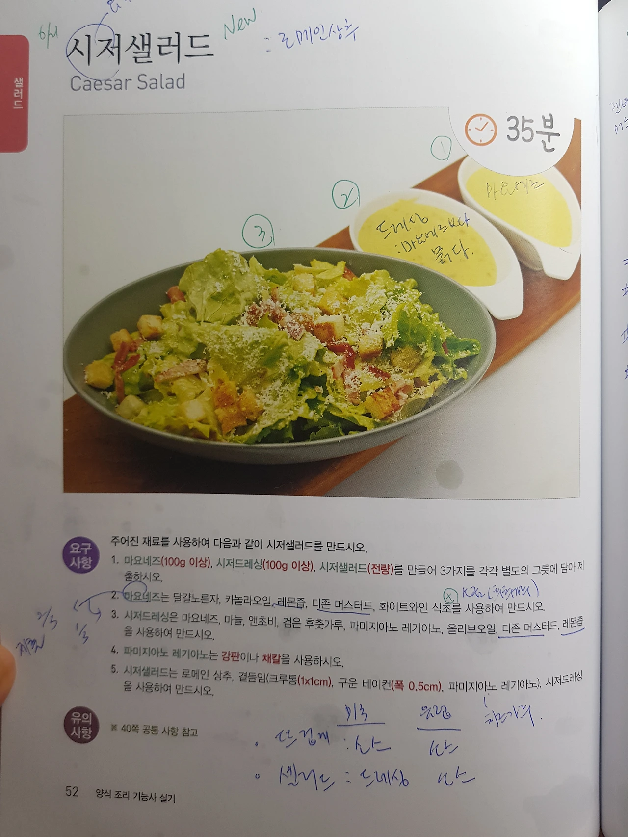 양식조리기능사 시험에 출제 되는 다른 종류의 샐러드 요리는 샐러드만 제출하면 되지만 시저샐러드는 추가적으로 마요네즈와 드레싱을 함께 제출해야 한다. 그러다 보니 요리의 시작은 마요네즈를 직접 만드는 것부터 시작한다. 그렇게 만든 마요네즈의 2/3는 완성그릇에 담아내고 나머지 1/3에 여러 가지 재료를 첨가해서 드레싱을 만들어 담고 마지막으로 로메인 상추, 쿠르통, 베이컨을 버무려 낸다.