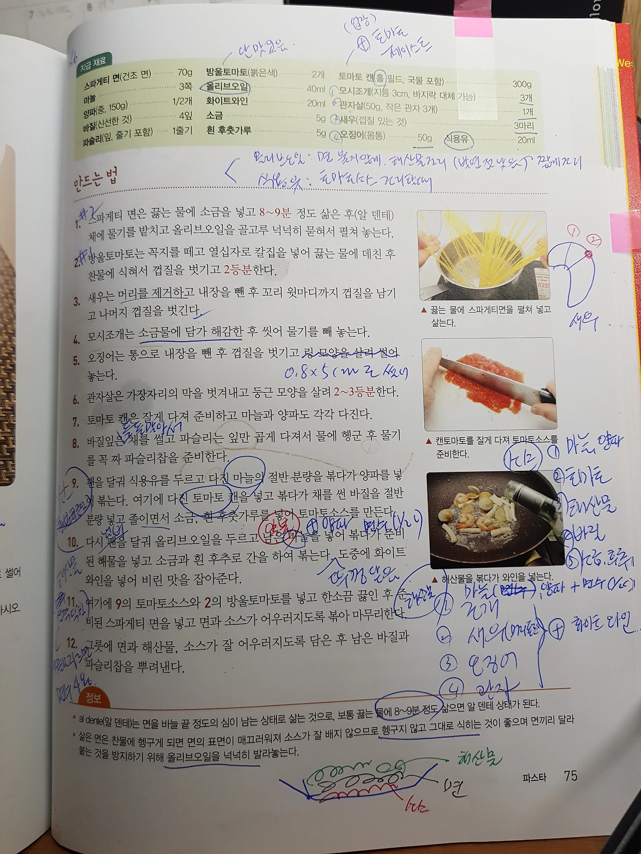 그러고 보니 토마토 스파게티에는 해산물이 생각보다 많이 들어간다. 모시조개(3개), 새우(3마리), 오징어(50그램), 관자살(1개)만 해도 양이 꽤 된다. 거기다가 토마토홀(300그램)과 방울토마토(2개)도 들어간다. 이것저것 부재료들이 많다 보니 완성접시에 생각 없이 담으면 주재료인 스파게티면이 안 보일 정도이다. 담을 때는 소소를 면 위에 붓지 말고 면을 주위에 둘러싸듯이 담고 면을 말아서 세우거나 눕히고 그 위에 해산물과 방울토마토를 올린다.