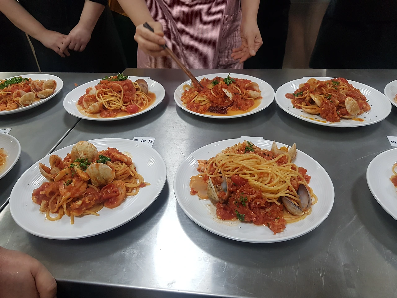재료 손실이 끝나면 냄비에 올리브 오일을 두르고 다진 마늘과 다진 양파를 반정도 넣고 약불에서 볶다가 면수(1/2컵)와 조개를 넣고 뚜껑을 닫는다. 조개가 벌어지면 나머지 해산물(새우, 오징어, 관자)과 화이트와인을 넣어 비린맛을 잡아준다. 팬을 달궈 식용유를 두르고 남은 다진 마늘과 다진 양파를 넣고 볶다가 토마토홀, 냄비에서 끓여놓은 해산물, 바질, 소금, 후추를 넣고 마지막에 방울토마토와 스파게티면을 넣고 소스가 잘 어우러지게 볶아 마무리한다. 완성그릇에 담은 후 썰어놓은 바질채와 파슬리찹을 뿌려낸다.