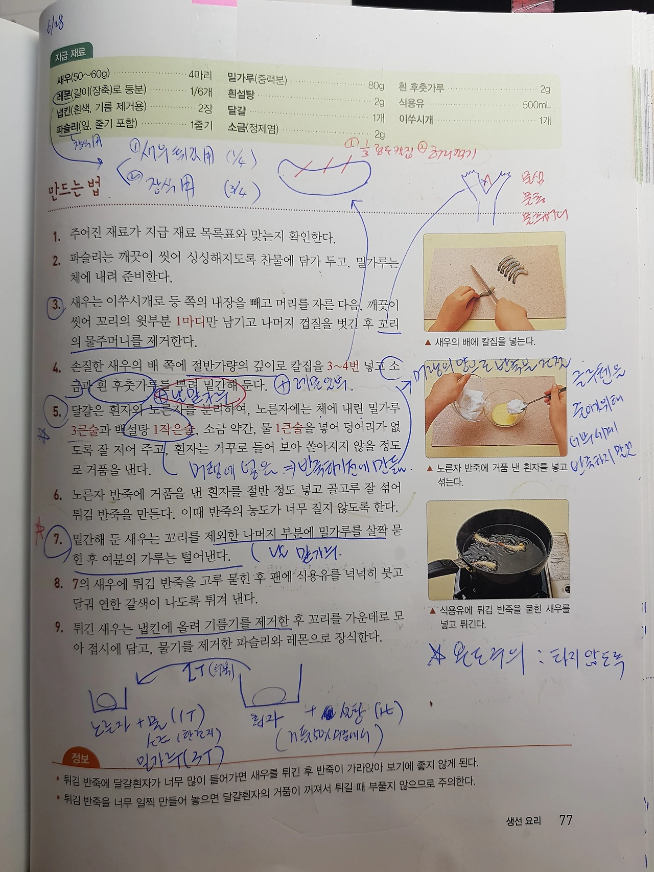 새우는 등 쪽 내장을 제거하고 꼬리 부분 물총(물샘, 물주머니)과 머리를 제거하고 꼬리 윗부분 1마디만 남기고 껍질을 벗겨낸다. 배쪽 부분에 칼집을 1/3 깊이로 3군데 내고 새우꺾기로 새우를 곧게 만들어 준다. 이 과정은 새우 배 쪽에 있는 힘줄을 끊어서 튀겼을 때 새우가 굽어지지 않고 일자로 형상을 유지할 수 있도록 하기 위함이다. 손질한 새우는 소금, 흰 후추가루, 레몬즙으로 밑간을 해둔다.