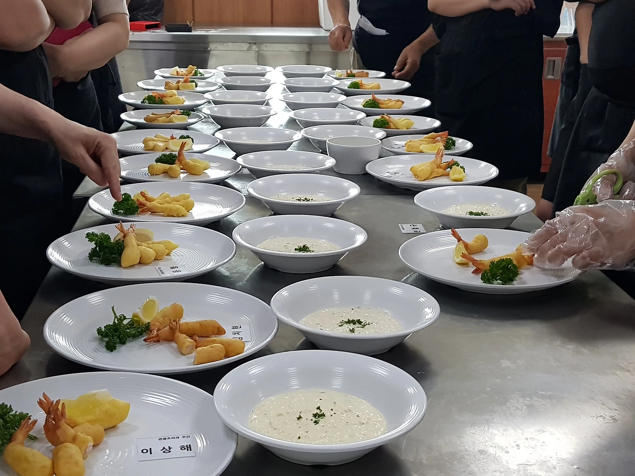 달걀흰자로 만든 머랭(설탕)과 달걀 노른자 혼합물(물, 소금, 밀가루)을 섞어 튀김 반죽을 만들되 너무 질지 않도록 한다. 밑간 해둔 새우는 꼬리를 제외한 나머지 부분에 밀가루를 살짝 묻힌 후에 튀김 반죽을 골고루 묻혀서 식용유에 연한 갈색이 나도록 튀겨낸다. 튀긴 새우는 냅킨에 올려 기름을 제거하고 꼬리를 가운데로 모아 접시에 담고 물기를 제거한 파슬리는 왼쪽, 레몬은 오른쪽에 장식한다.