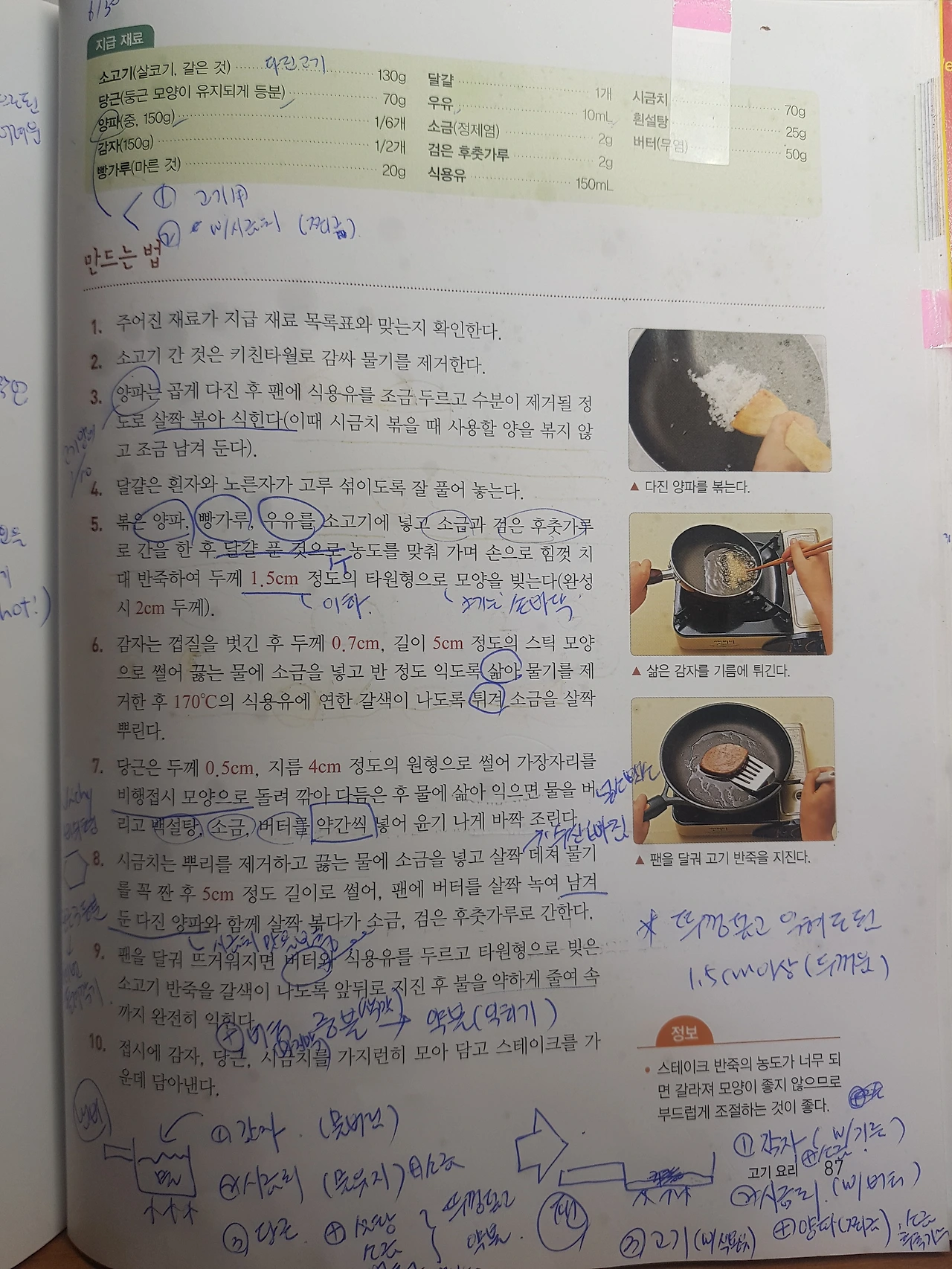 소고기 간 것은 키친타월로 핏기를 제거하고 양파는 잘게 다져 기름에 볶아내서 식힌다. 다진 양파는 고기 반죽과 시금치 볶을 때 사용한다. 고기반죽에는 양파(반죽의 10% 정도), 빵가루, 우유(2작은술), 소금, 검은 후추, 달걀물(1큰술)을 넣고 힘껏 치대고 타원형 모양으로 빚는다. 고기는 익으면 크기는 줄고 두께는 두꺼워짐으로 완성두께가 2cm정도가 되도록 빚을 때는 1.5cm 두께로 만든다.