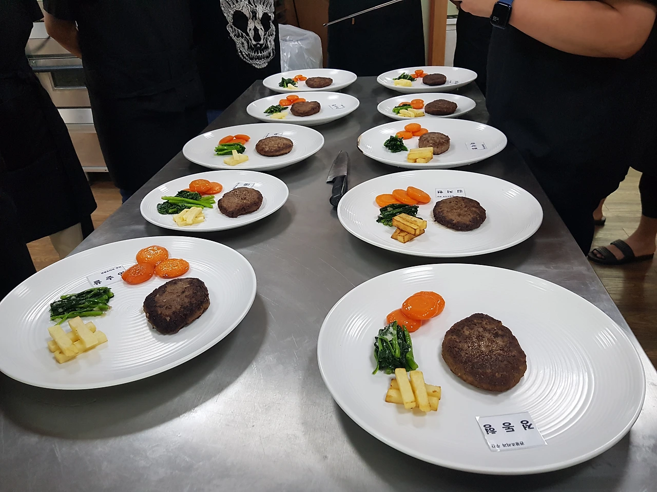 갈색으로 잘 익은 고기는 럭비공 모양처럼 타원형이다. 감자튀김은 감자를 깎아서 스틱모양을 4개 이상 만들어 물에 데치고 다시 갈색으로 튀겨내고 시금치는 물에 살짝 '넣소 뺏소' 느낌으로 데치고 나서 다져놓은 양파와 함께 다시 볶는다. 시금치 무침으로만 먹던 맛과는 색다른 맛이다. 당근은 원형으로 3개 정도 자르고 위면과 아랫면을 돌려 깎아 물에 데치고 졸여내서 장식된다.