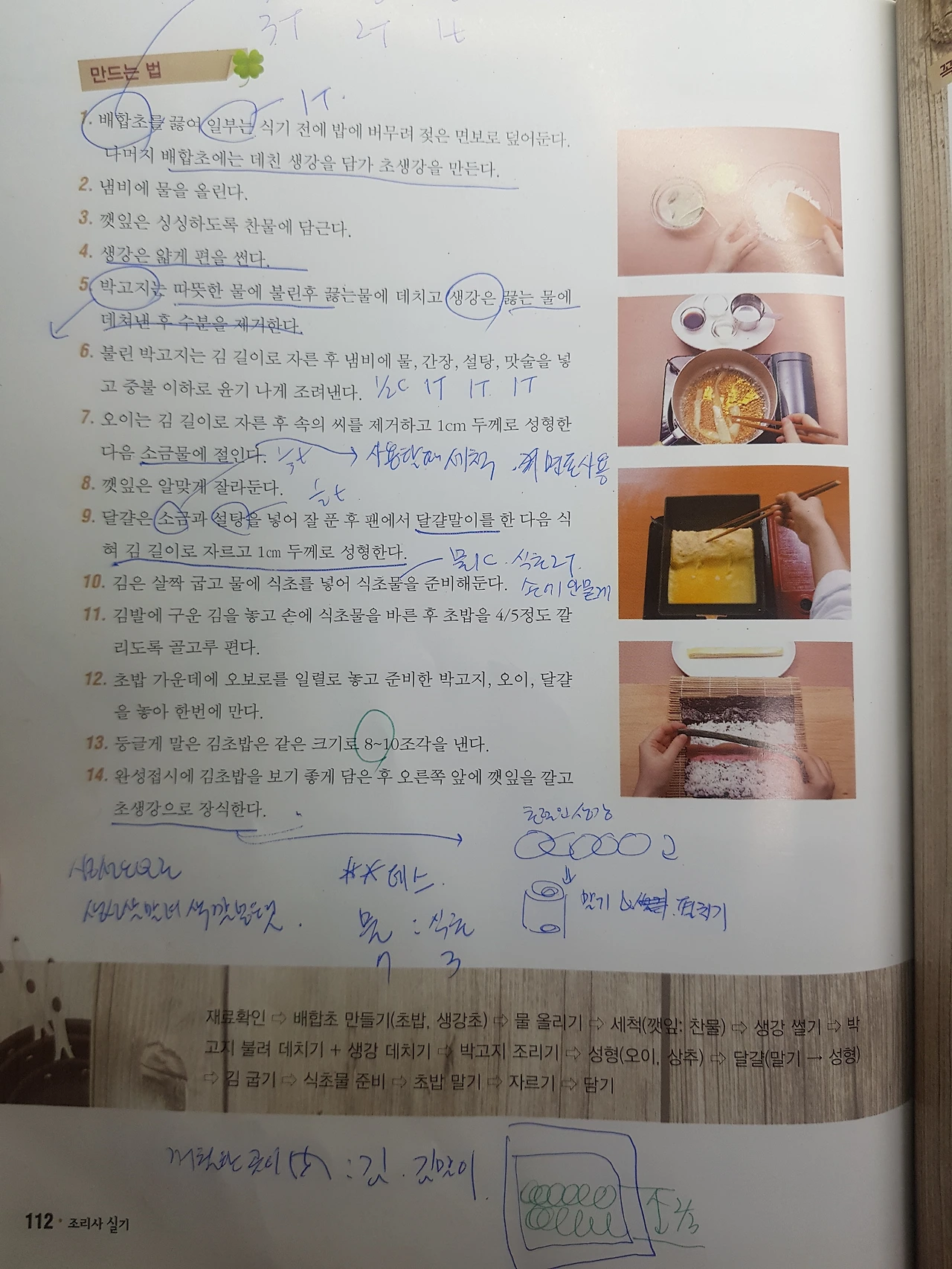 배합초는 식초(3큰술), 설탕(2큰술), 소금(1작은술)을 넣어 끓여 밥이 식기 전에 1큰술을 섞고 젖은 면포로 덮어두고 남은 배합초는 초생강을 만드는 데 사용한다. 한식조리기능사나 중식조리기능사 시험에서는 밥을 직접 지어서 조리하는데 일식조리기능사 시험에서는 생쌀이 아닌 지어진 밥이 제공된다. '앗싸~!' 다행히 밥을 태울 위험은 없다.