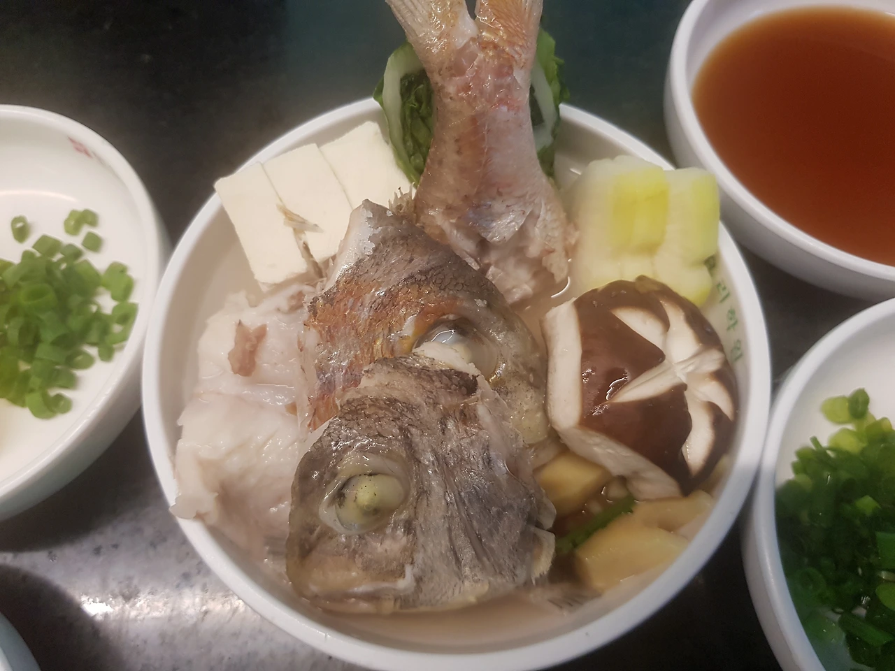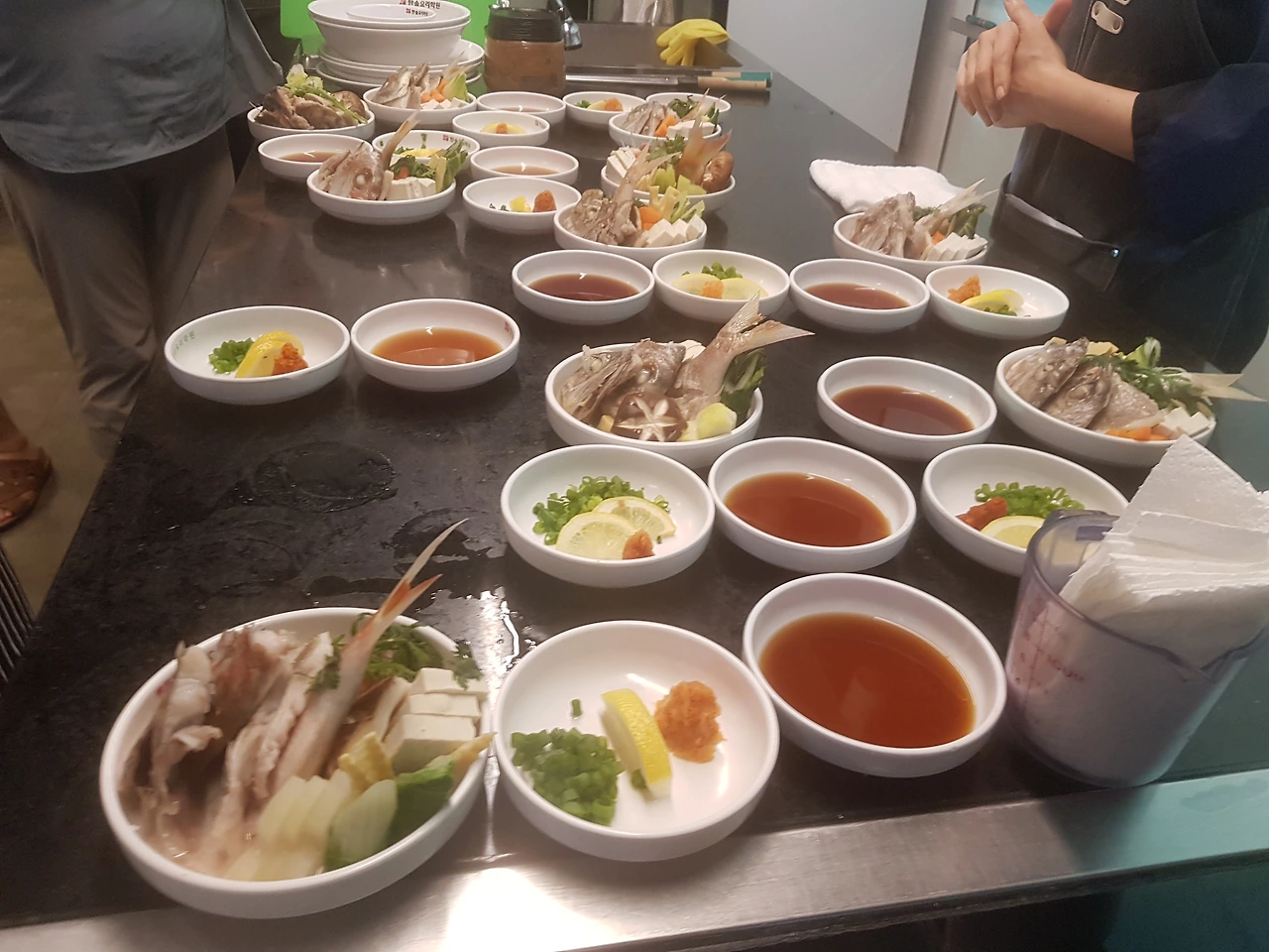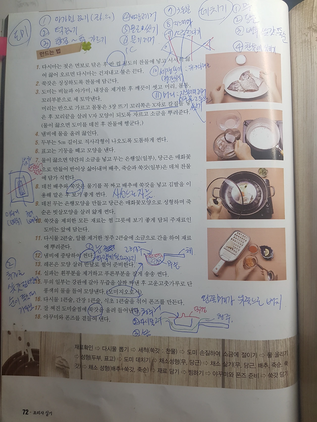 생선의 눈알이 투명색에서 하얀색이 될 때까지 익혀주며 중간에 남긴 쑥갓을 넣어 순이 죽으면 냄비바닥에 깔아 둔 행주를 이용해서 완성그릇을 꺼낸다. 완성그릇 외에 초간장(다시물, 간장, 식초)과 야꾸미(실파, 레몬, 무 간 것+고운 고춧가루)를 만들어 추가하면 끝이다. '도마술찜'은 제한시간 30분짜리로 19가지 일식요리 중에 제일 어려운 요리다. 이번 실습은 시간초과로 '탈락'이지만 실전에서는 '합격'을 기원한다.