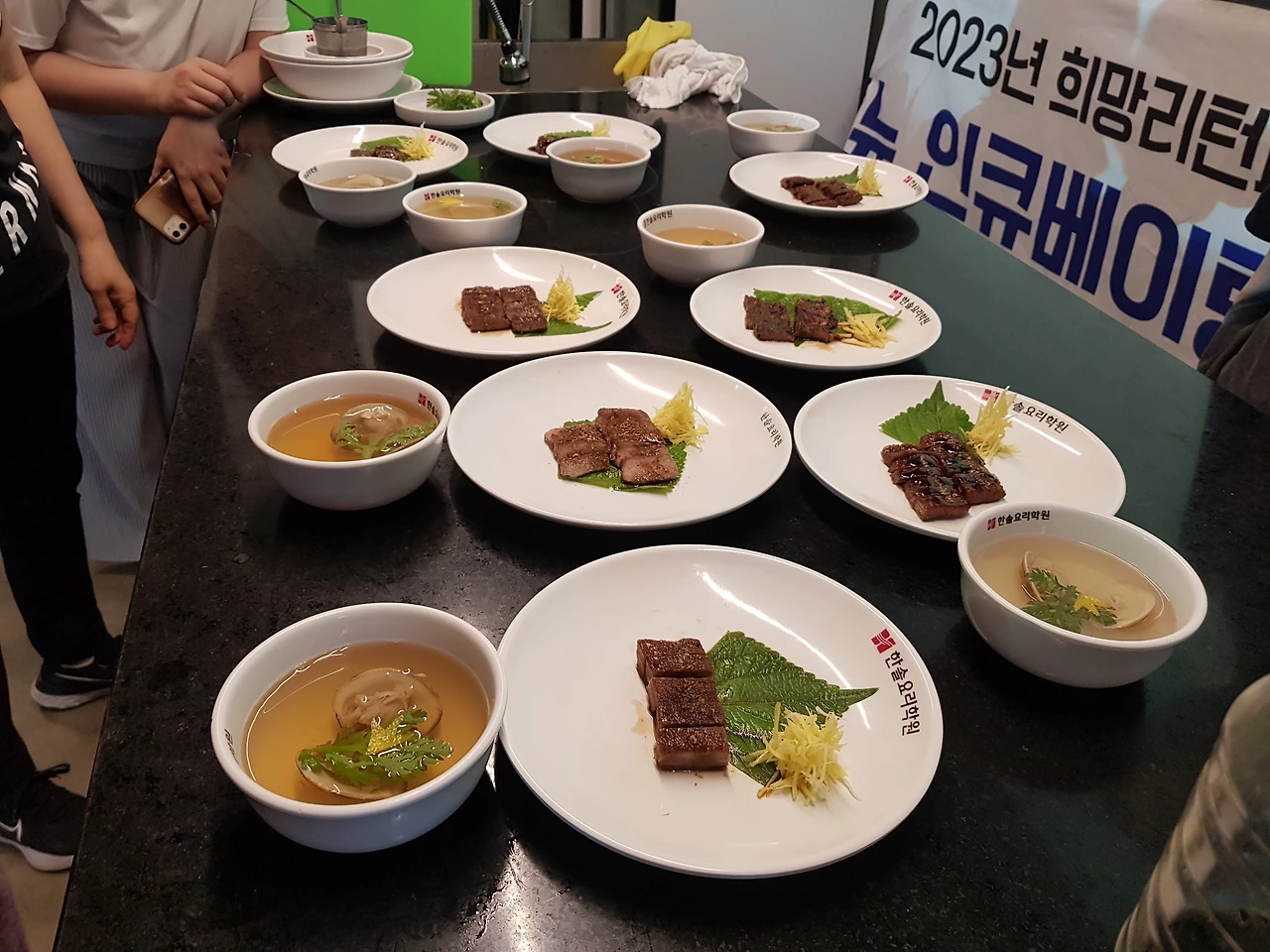 찬물(1컵)에 다시마를 면포에 닦아 넣고 끓기 시작하면 다시마를 건저내고 불을 끊다. 소고기는 1.5cm 두께로 잘라 양쪽면에 힘줄이 끊어지도록 칼집을 넣고 충분히 연육 후에 소금, 검은 후춧가루를 뿌려서 밑간을 해둔다. 생강은 껍질을 벗기고 최대한 얇게 편을 썬 후 다시 채을 썰어 찬물에 담가 매운맛을 뺀다.