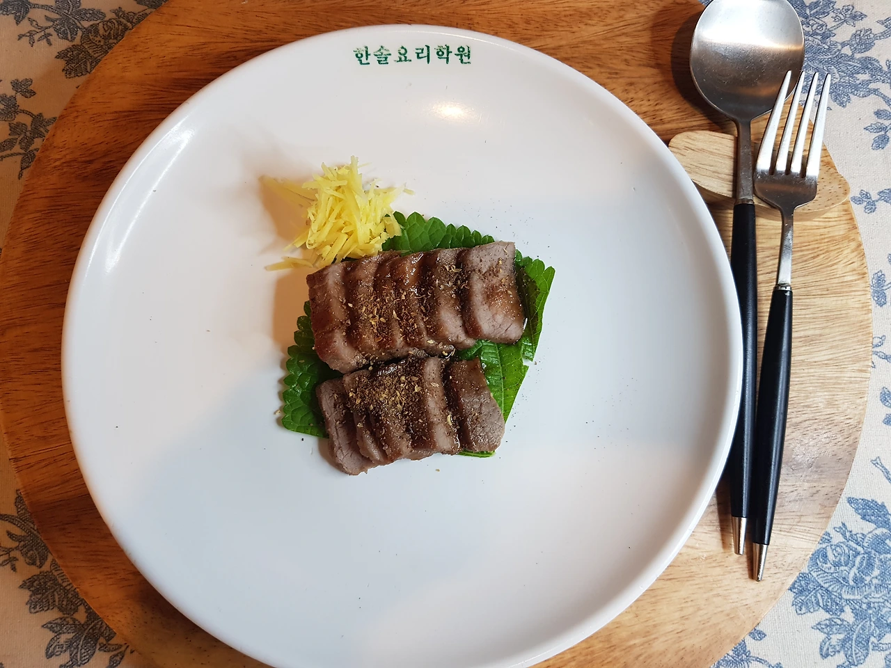 구워진 고기는 3x1.5cm로 먹기 좋게 저며가며 자르고 완성접시에 물기를 제거한 깻잎을 깔고 올린다. 고기 위에는 산초가루를 뿌려준다. 추가적으로 생강채를 체에 걸러 물기를 짜고 봉곳하게 손으로 다듬어 고기옆에 장식한다. 평가를 마치고 생각을 살짝 고기 위에 올려 한 입 먹어본다. 달짝지근한 소스와 쌉싸름한 생강이 고기맛을 더해준다. 150년 전 일본에서는 상상도 못 할 맛이다.