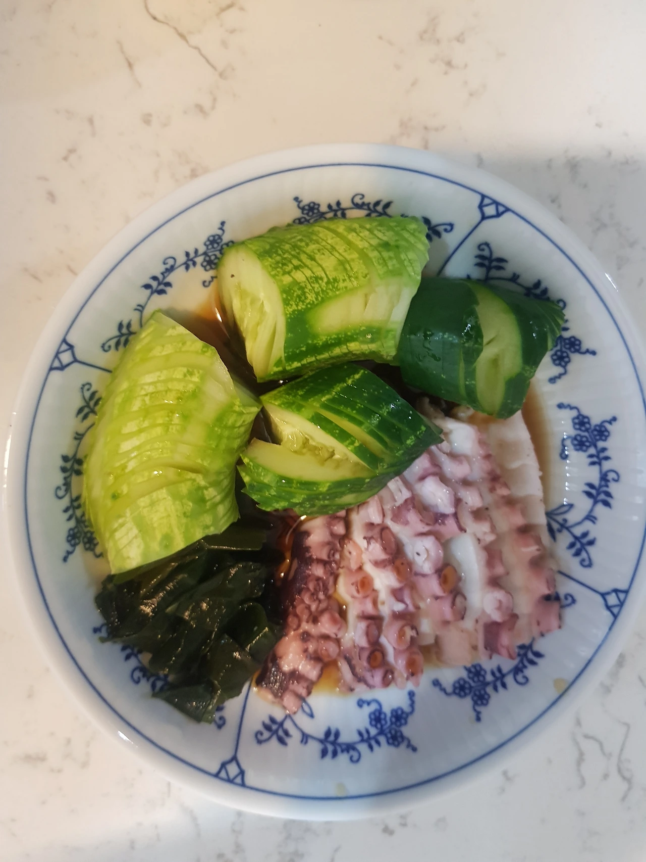 양념초간장(도사스)을 '다간식설(다시마 육수 1큰술, 간장 1큰술, 식초 1큰술, 설탕 1큰술)'로 만들어 놓고 끓는 물에 약간의 소금을 넣고 미역을 데쳐 찬물에 헹군다. 미역 데친 물에 다시 문어다리를 꼬지를 꽂아 약간의 간장과 식초를 넣고 문어를 삶고 찬물에 식혀 꼬지를 제거하면 다리가 일직선을 유지한다. 오이는 사선으로 앞뒷면을 촘촘하게 어슷하게 칼집을 넣어 소금물에 절여둔다(자바라 기리).