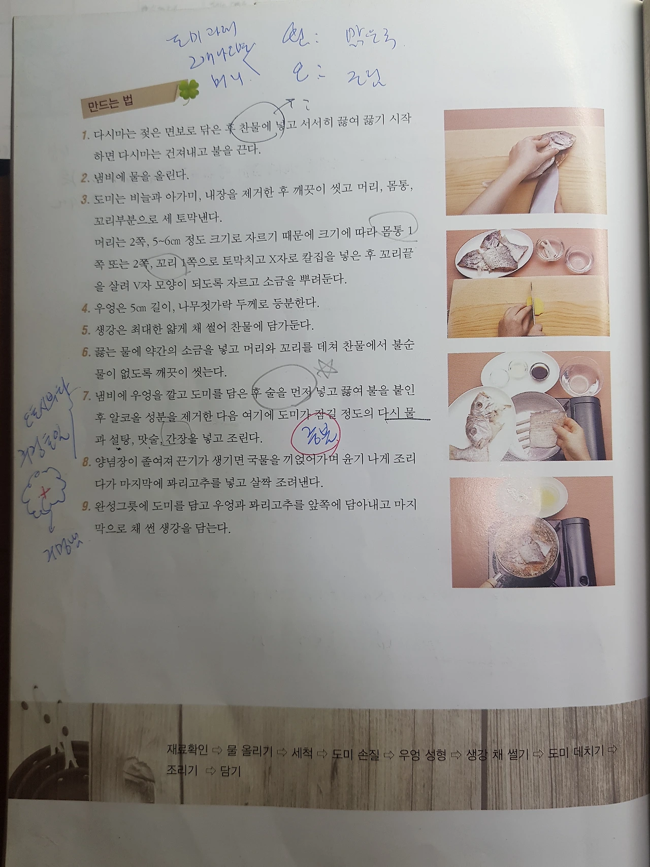 도미술찜을 만들기 위해 처음 접했던 도미를 다시 만났다. 딱딱한 도미 대가리를 반으로 자르기가 정말 힘들어서 '일식조리기능사 실기시험을 포기해야 하나' 라는 생각까지 들었다. 실제로 도미 대가리를 자르는데 쩔쩔매던 수강생 중에 한 명은 그다음 수업부터 아예 출석을 하지를 않았다. 도미조림에서 다시 만난 도미 대가리를 보니 왠지 오기가 발동했다.