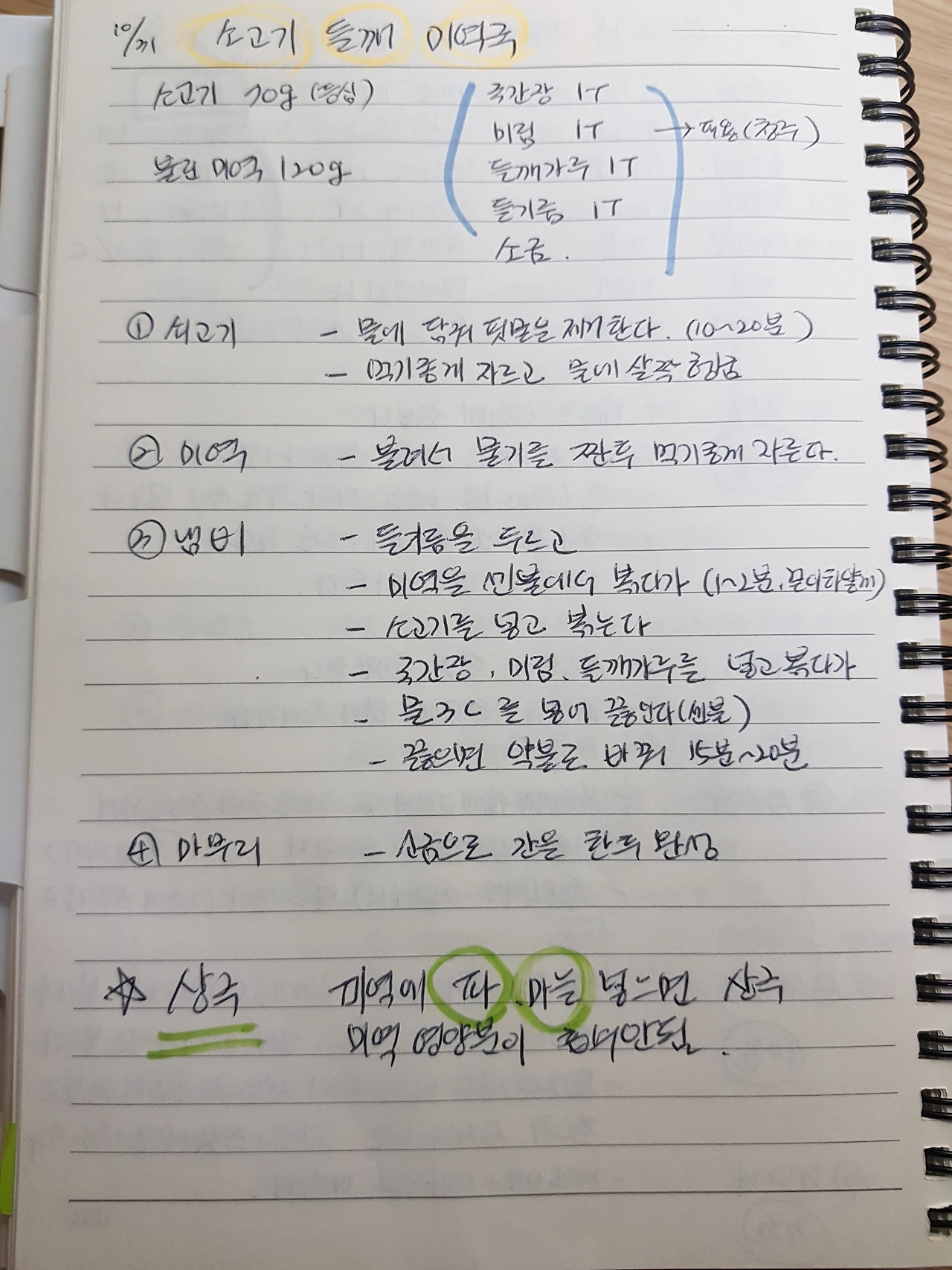 한식의 대부분의 요리에는 파, 마늘이 들어가나 미역에는 파, 마늘을 넣으면 상극임으로 절대로 넣으면 안 된다. (*1인분 기준임으로 2인분을 만들고자 하면 위의 재료량에 2배를 넣으면 된다.)