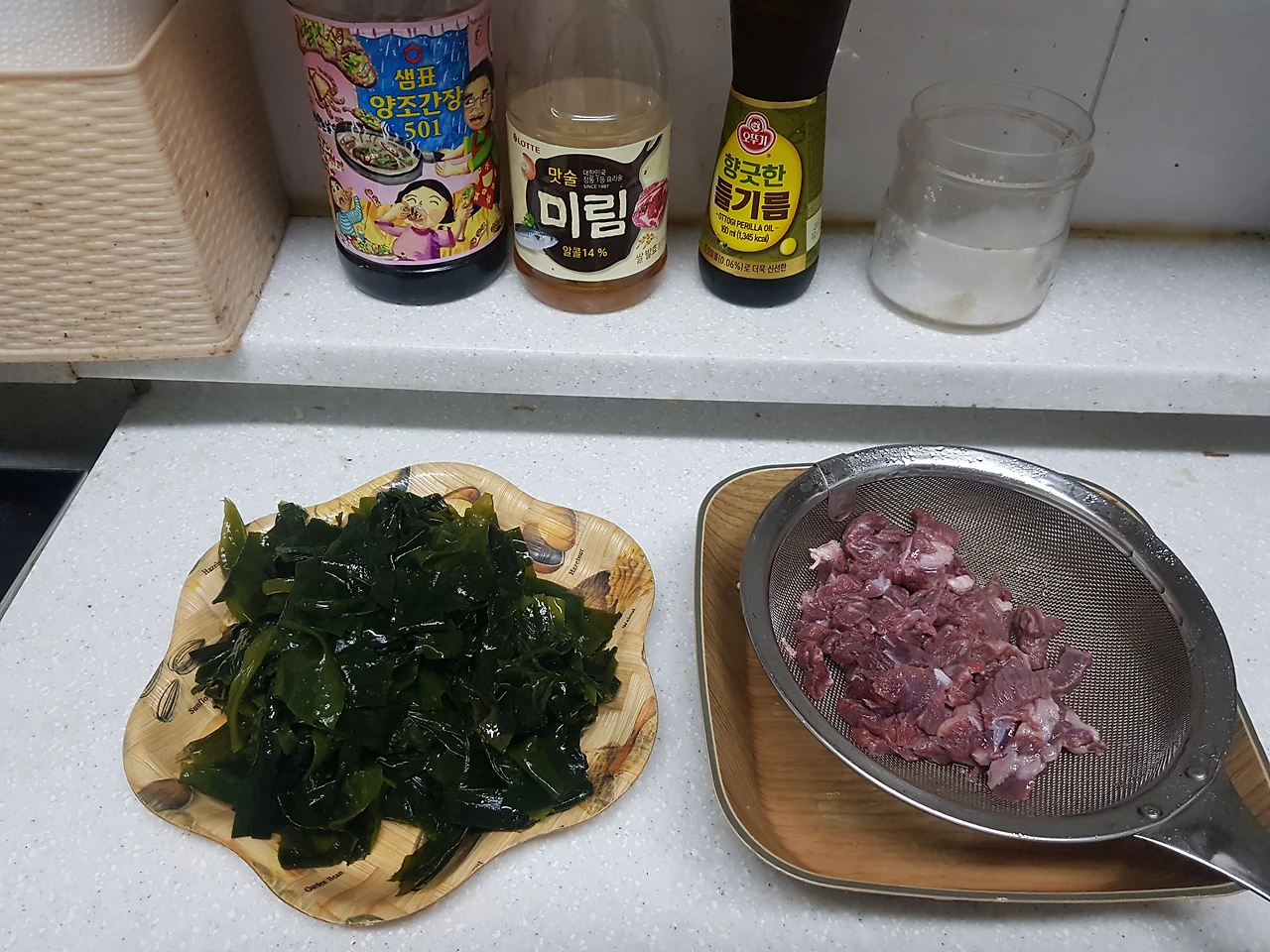 소고기(70g)는 물에 담가 핏물을 제거하고 먹기 좋은 크기로 자르고 물에 헹궈둔다. 미역(120g)은 불에 한 시간 정도 불려서 물기를 짠 후에 먹기 좋게 자른다. 냄비에 들기름을 두르고 미역을 센 불에서 1~2분 정도 겉이 하얗게 될 때까지 볶다가 소고기를 넣고 다시 볶는다.