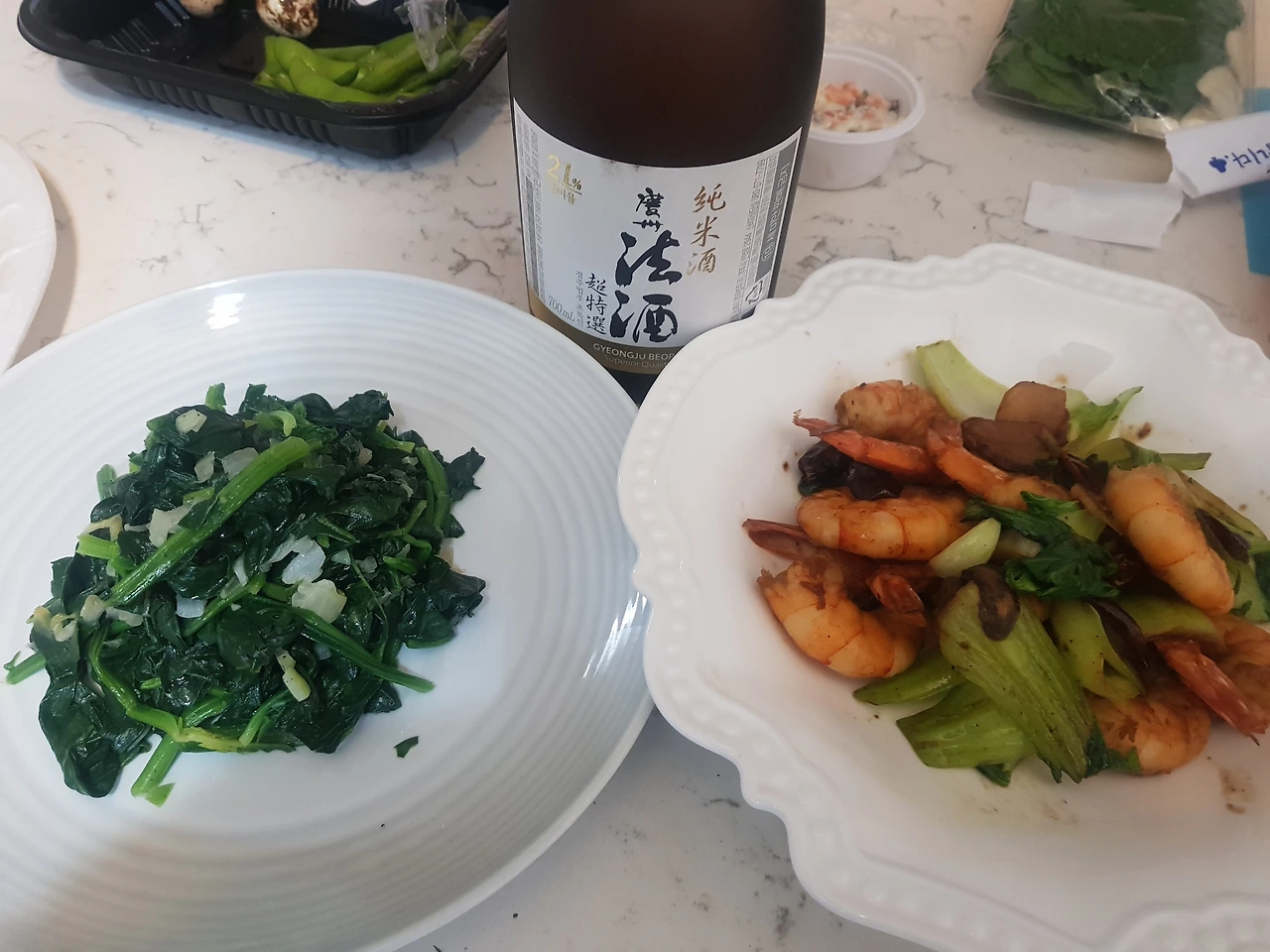 '에라 모르겠다' 하는 심정으로 간장, 청주 그리고 페페론치노와 중식에서 많이 사용하는 청경채까지 잘라서 넣고 소금과 후추로 마무리를 했다. '새우버터구이'는 갑자기 '양식'에서 '중식'으로 바뀌었다. 다행히 맛을 본 아들의 '맛있다~'는 한마디에 마음이 기분이 좋아졌다. 어찌 되었던 두 가지 요리를 접시에 담아놓고 선물 받은 청주도 잔에 따라 놓으니 그럴싸했다.