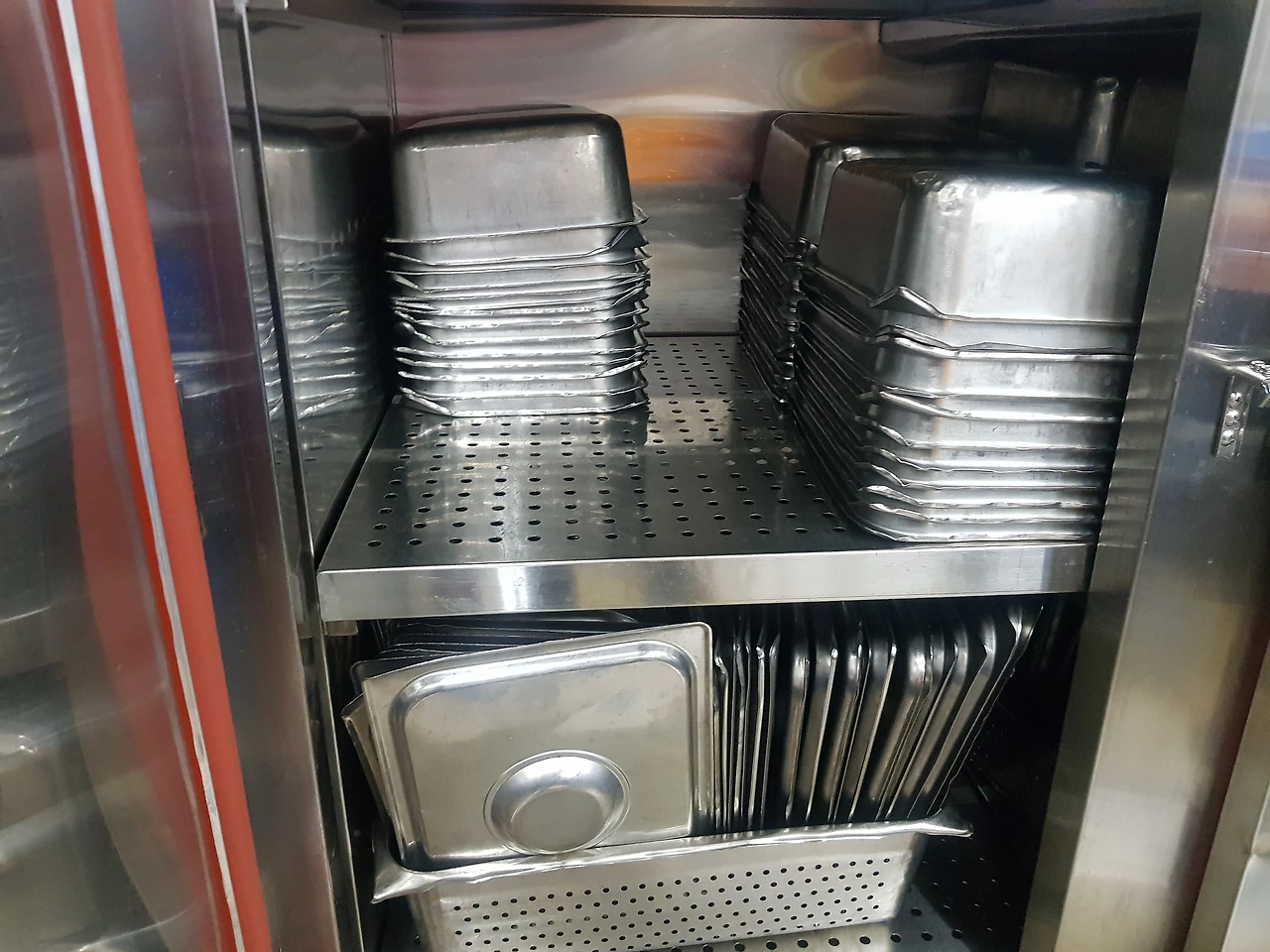 동료가 던진 반찬통이 물이 하나 가득 담긴 사각 세척통에 입수하면서 잔반 찌꺼기로 인해 지저분해진 물이 사방을 튄다. 가끔은 튕긴 물이 얼굴에 튀기기도 한다. 기분이 영 찝찝하지만 얼굴을 닦아낼 시간조차 긴박하다. 손에 잡은 수세미는 내려놓지 않고 계속 반찬통을 훑어내면서 옆에 있는 이단케리어에 차곡차곡 쌓는다. 쌓인 반찬통은 다음 프로세스인 자동 세척기계로 보내진다.