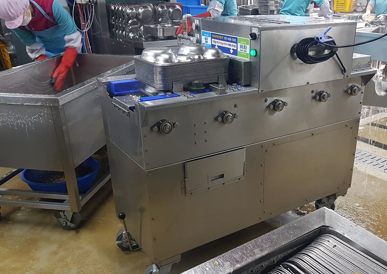기계 내부에서는 고압노즐을 통해 세척액이 뜨거운 물과 섞여 분출하고 식판은 회전 브러시 사이로 미끄러지듯이 통과한다. 초벌 세척된 식판은 기계 출구에 쌓이고, 쌓인 식판을 다시 깨끗한 물이 담긴 세척통에 담가두었다가 세척기에 식판을 넣을 수 있도록 소형테이블에 올려주면 된다.