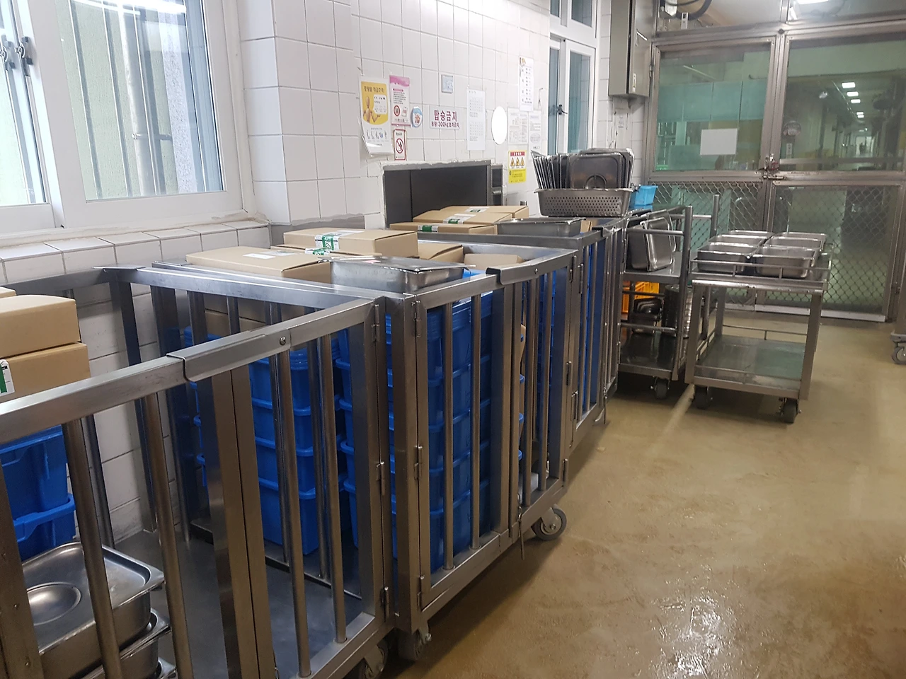 집기류의 개수는 아침조회 때 메뉴표를 보고 반찬종류에 따라 달라지는데 보통은 집게 2개, 롱스푼 2개, 국자 1개, 밥주걱 1개이고 식판은 대략 30개 정도를 파란 통 하나에 꽉 채워 넣는다. 사자 우리처럼 생긴 케리어 세 곳에는 각각 13개의 파란 통이 실리고 덤웨이더 옆으로 옮겨진다. 다음은 숟가락, 젓가락통을 소독고에 꺼내서 층별로 챙기고 선반 위에 놓인 국통(50개 정도)도 내려서 국담당 구역으로 옮겨놓는다.