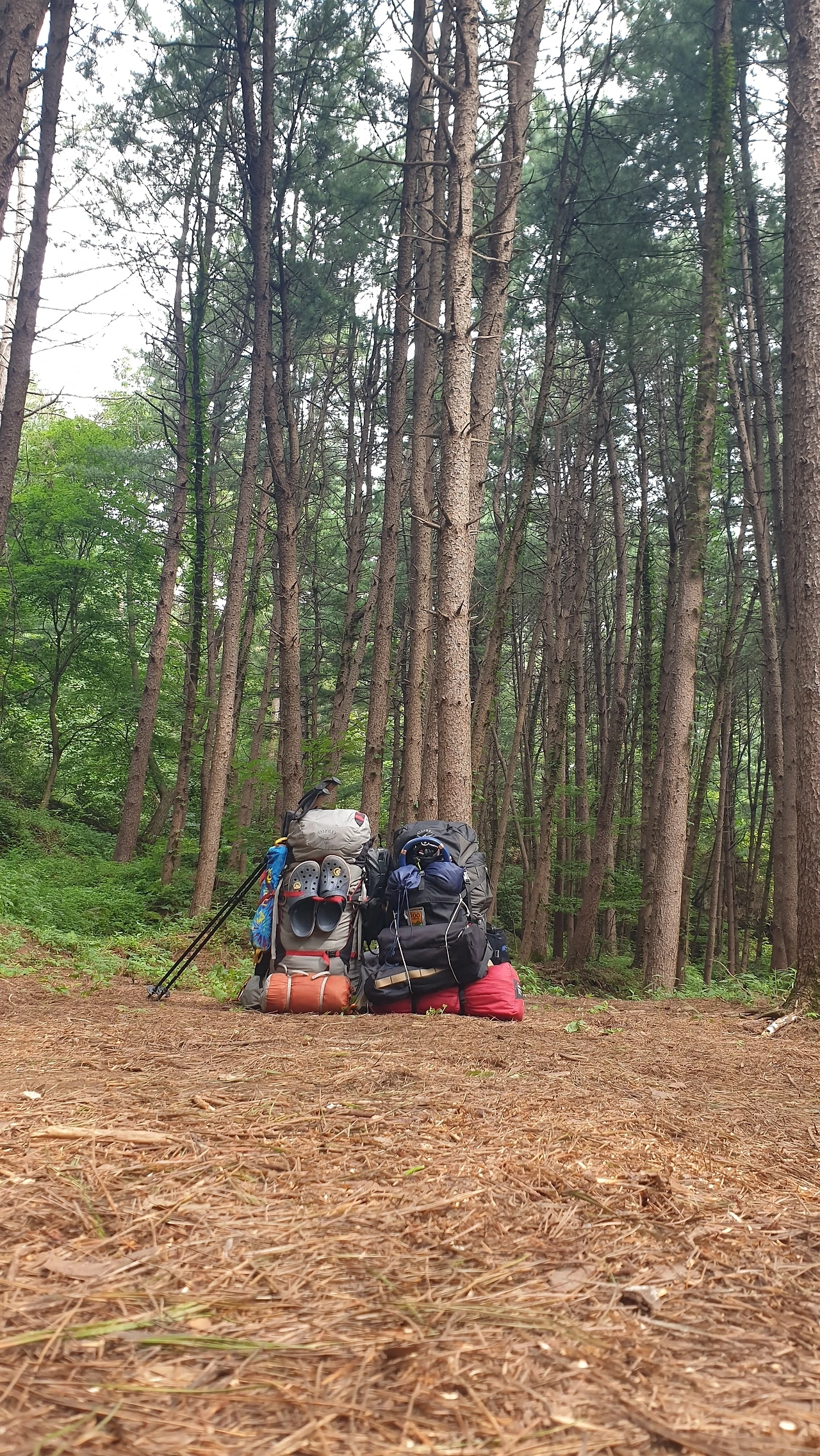 퇴직하고 반백수로 지내다 보니 따로 여름휴가를 떠나기가 민망하기도 해서 가볍게 계곡물에 발이라도 담가볼 요량으로 친구와 함께 캠핑장을 찾았다. 서울 인근 휴게소에 차를 주차하고 한차로 한 시간 반을 달려 경기도 가평에 있는 잣나무숲에 도착했다. 박배낭을 내려놓자 마자 후다닥 의자와 테이블부터 조립한다.