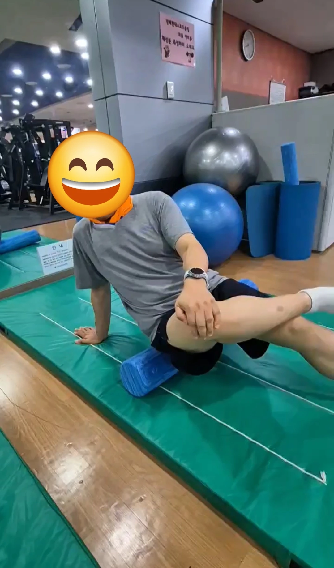 그렇게 몸을 풀고 다음단계는 바닥 매트에서 '홈롤러'를 활용해서 자가 마사지를 한다. 앉은 자세에서 한쪽 다리를 꼬고, 엉덩이를 홈롤러 위에 문지르면서 엉덩이 근육을 풀어준다. 반대쪽도 같은 요령으로 하고 나서 이제는 누워서 허리밑에 홈 롤러를 두고 문지른다. 허리주위에 경직된 근육들이 부들부들하게 변하면서 시원함이 느껴진다. 모든 과정들이 트레이너에 의해 녹화되고 사진 찍혀서 개인 카톡으로 실시간 전송된다.