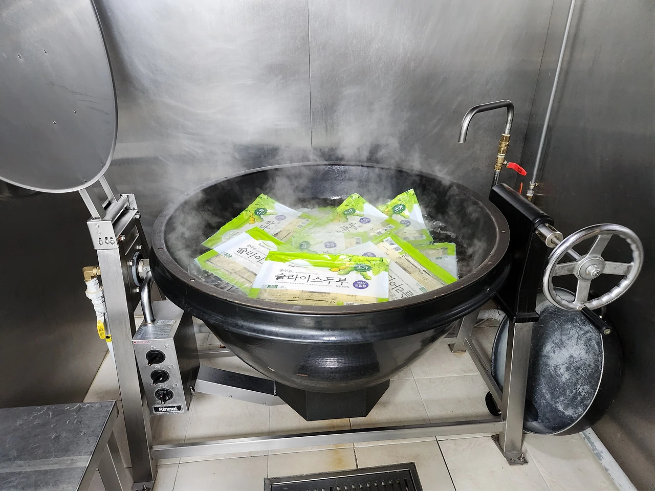 한쪽에서는 '양념 온두부' 조리를 위해 대용량 국솥에 물을 끓여 포장된 두부를 따뜻하게 덥힌다. 포장된 두부는 공장에서부터 미리 절단된 상태라서 두부를 잘라야 하는 수고는 덜었지만 저걸 어떻게 바트(용기)에 담아야 하나 고민이 되었다. 하지만 노련한 봉사자 언니는 두부 포장 용기의 물을 쪽 빼고 한쪽면을 가위로 자르고 미끄러뜨려서 순식간에 바트(용기)에 담는다. '대단한 노하우다, 존경스럽다!'