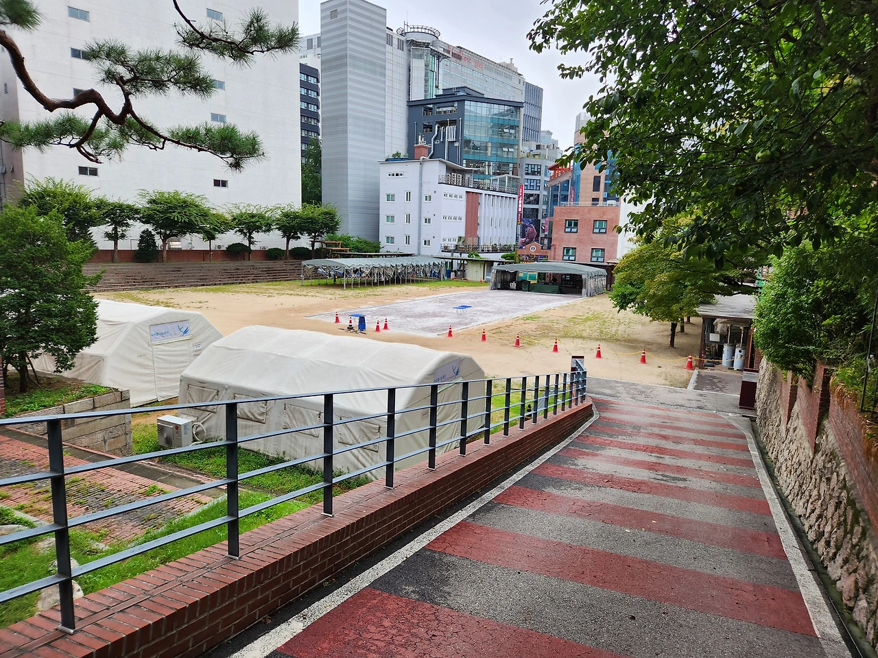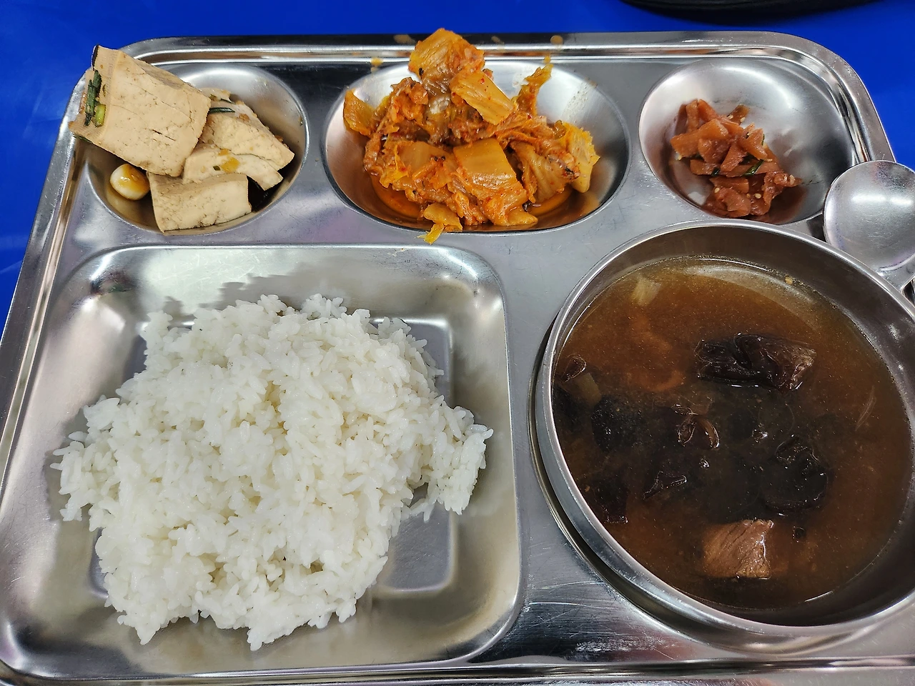 따뜻한 '온두부'는 미리준비된 양념간장이 뿌려져서 잘 익은 '김치 꽁치찜'과 함께 식당으로 배달된다. 오전봉사를 끝내고 간이 천막 식당이 있는 운동장으로 올라와 보니 비가 부슬부슬 내린다. 식사를 하러 온 손님들이 평소와는 다르게 비를 피해 삼삼오오 나무밑이나 건물 처마 밑에서 순번을 기다리고 있다. 무더운 여름날씨가 아직까지 기승을 부리고 있지만 비가 내려 잠시 차가운 기운이 맴돈다. 따뜻한 꽁치김치찜과 온두부가 우리 모두에게 온기를 불어넣어 주면 좋겠다.