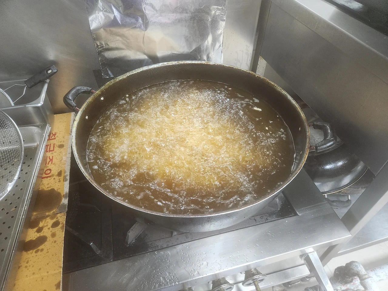 타닥타닥 빗소리를 내기 시작하며 기름솥에는 전병이 몸부림치기 시작한다. 해동된 전병을 뜰채에 담아 미끄러지듯이 기름솥에 부으면 한동안 모습을 감추었다가 서서히 유면 위로 떠오른다. 그때부터 시선은 전병껍질에 고정된다. 정확하게 말하자면 껍질의 색깔이 변하는 정도를 확인한다. 중간중간 뜰채로 휘휘 저으면서 붙어있는 전병들을 분리시키고 위아래 골고루 튀겨지기 위해 한 번씩 뒤집어 주기도 한다.