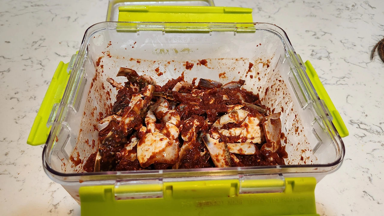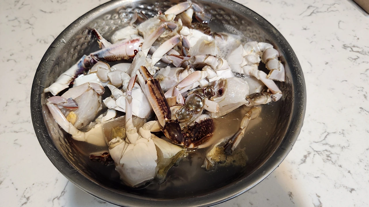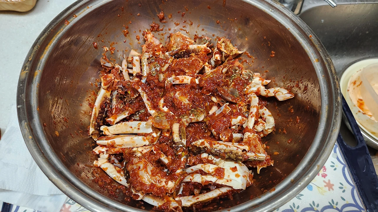 확실히 전문가는 전문가다. 저걸 내가 집에서 손실한다면 아마도 하루종일 걸렸을 것을 몇 분 만에 끝내버리다니 말이다. 그래도 집에 와서 일일이 칫솔로 껍데기를 세척하고 집게발은 망치로 툭툭 깨트렸다. 깨끗하게 세척된 꽃게는 살이 단단해지게 하기 위해 잠시 식초물에 담가두고 양념장을 만든다.