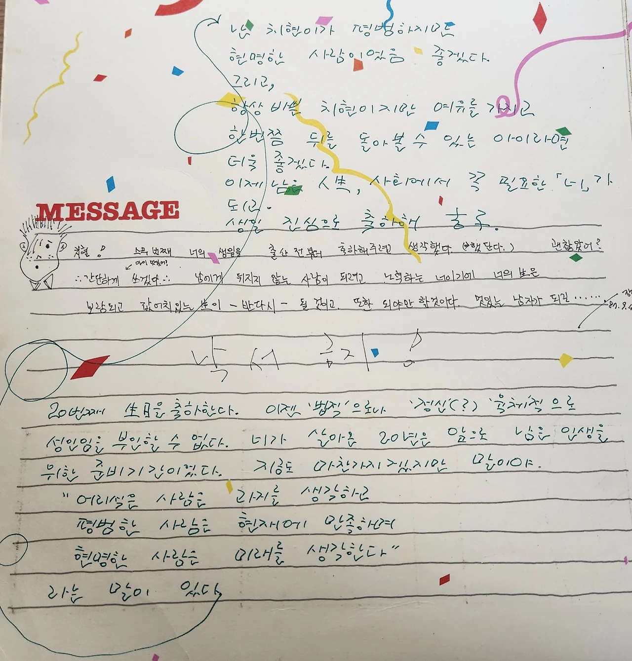 그 후로도 자주는 아니어도 가끔은 분당 미술학원 뒤에서 얼굴 보며 소주잔을 기울이던 추억들이 생각난다. 이제는 다시 만나서 환하게 웃는 너의 모습을 볼 수는 없겠지만 내 머릿속에는 영원히 기억할 듯싶다. 우리의 정신적 지주, 영원한 리더. 잘 가시게나, 친구.