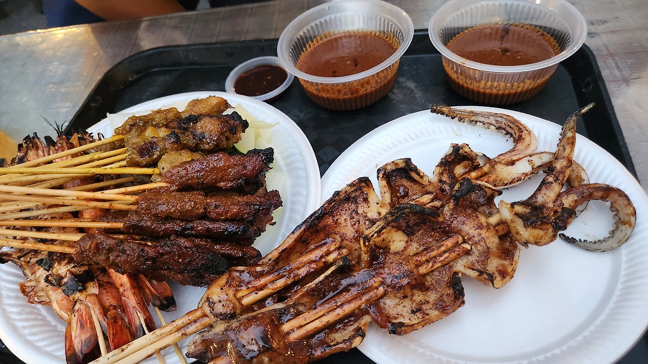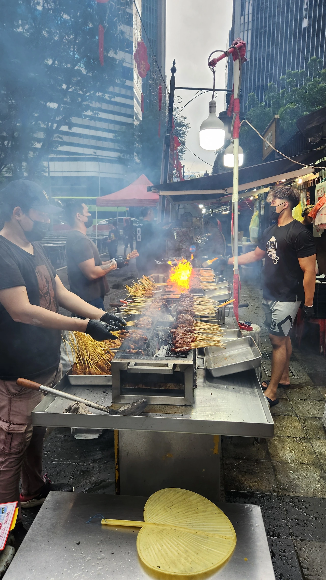 도심 한복판에 차가 쌩쌩 달리고 있지만 어느새인가 보도블록 위에 설치된 화로대에서는 연기가 힘차게 피어오르고 있다. 스무 개 남짓한 노천 가계에 놓인 화로대 앞에서는 등뒤에 번호가 커다랗게 쓰여있는 티셔츠를 입고 있는 상인들이 메뉴판을 들고 호객행위를 하고 있다.