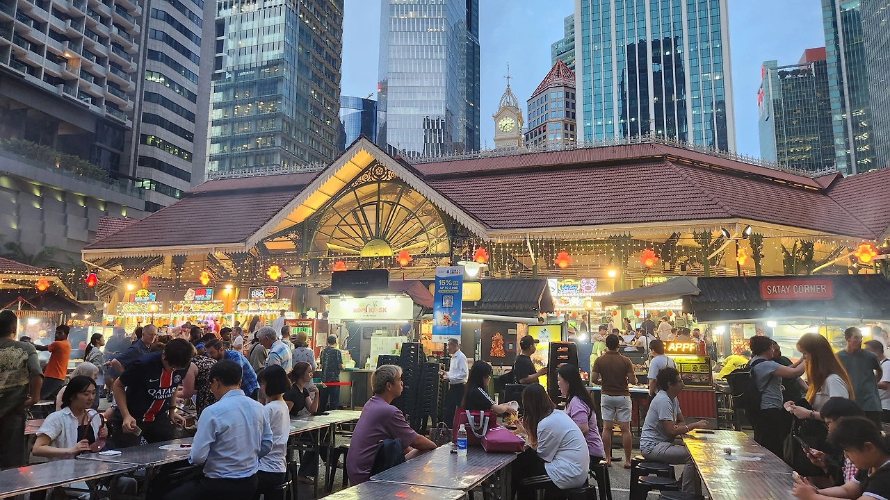 조립식 탁자가 줄지어 설치되자마자 기다리던 손님들은 보도블록 위에 쌓여있던 플라스틱의자를 챙겨서 테이블에 앉기 시작했다. 일행도 의자 4개를 챙기고 앉자마자, 시원한 타이거 생맥주를 꿀꺽꿀꺽 거침없이 쏟아부었다. '캬~아! 시원하다.' 도심 한복판 노천식당에서 느끼는 생소하지만 추억에 남는 '싱가포르의 맛'이다.