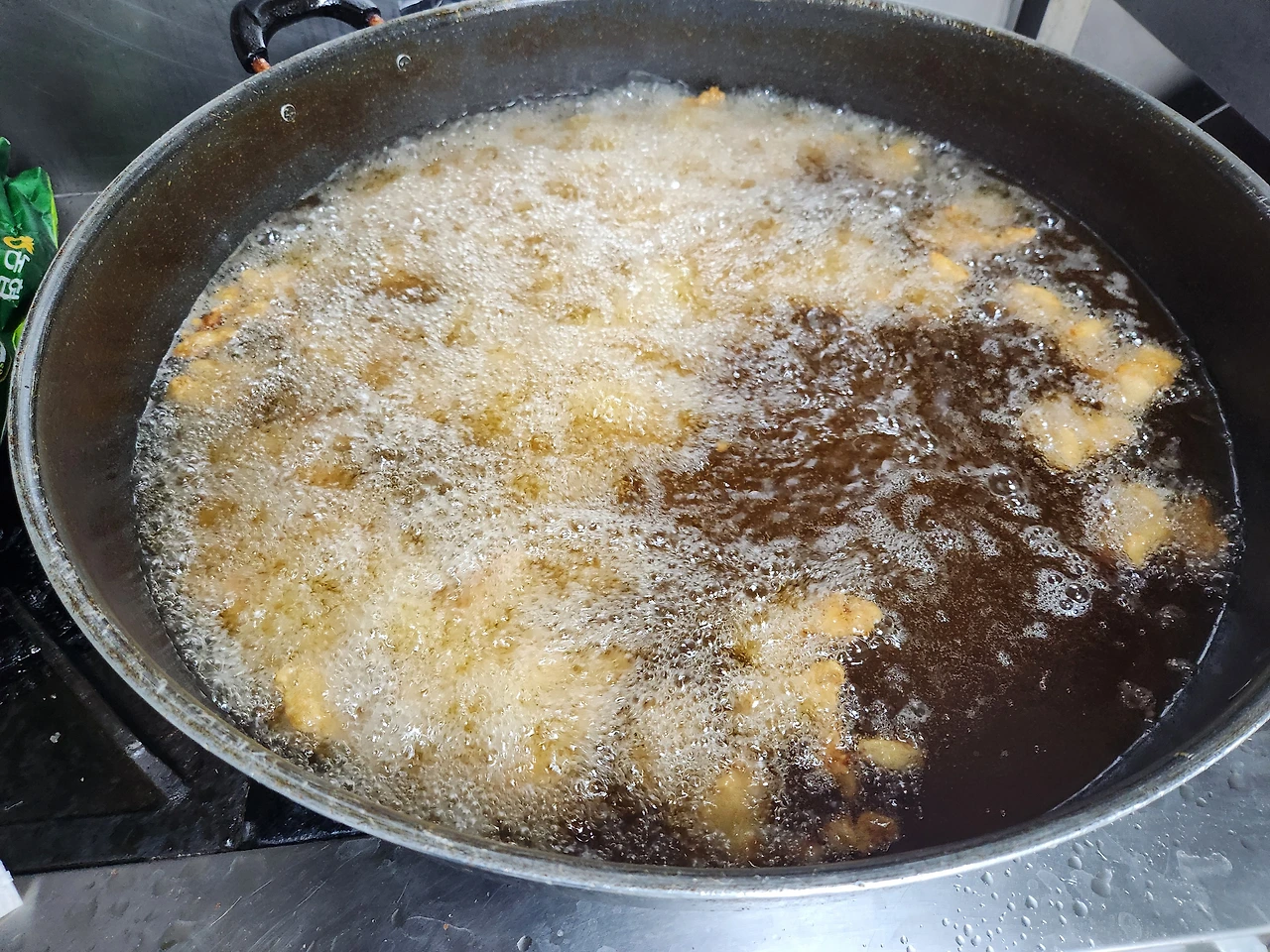 '콸콸콸~' 업소용 사각형 기름통을 두 손 무겁게 들어올려 커다란 대형냄비에 기름을 붓는다. 투명한 튀김용 기름은 튀김 맛을 더욱 신선하게 만든다. 화구에 불을 붙이고 열이 오를 때까지 기다린다. 그러는 동안 박스를 뜯고 비닐봉지 3개를 개봉해서 '치킨 가라아게'를 바구니에 담아 놓는다.