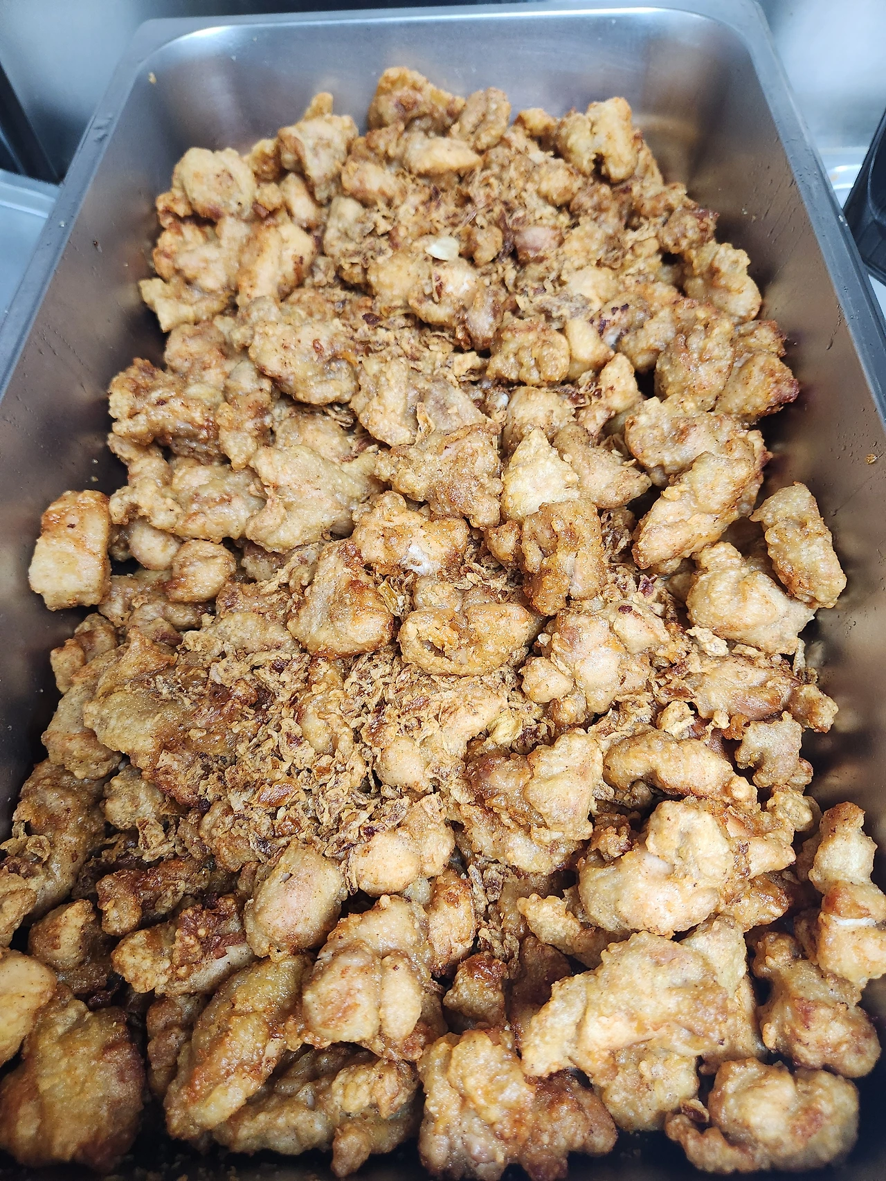 식당으로 나가기 전에 양파튀김가루를 골고루 뿌려주면 끝이다. 혹시라도 눅눅해질 수 있음으로 뚜껑은 살짝 비스듬히 덮어서 쌓기를 시작한다. 역시나 배식이 시작하자마자 배식용 바트를 쌓을 겨를 없이 계속 식당으로 배송된다. '바쁘다 바빠!' 역시, 튀김은 오늘도 인기 메뉴이다.