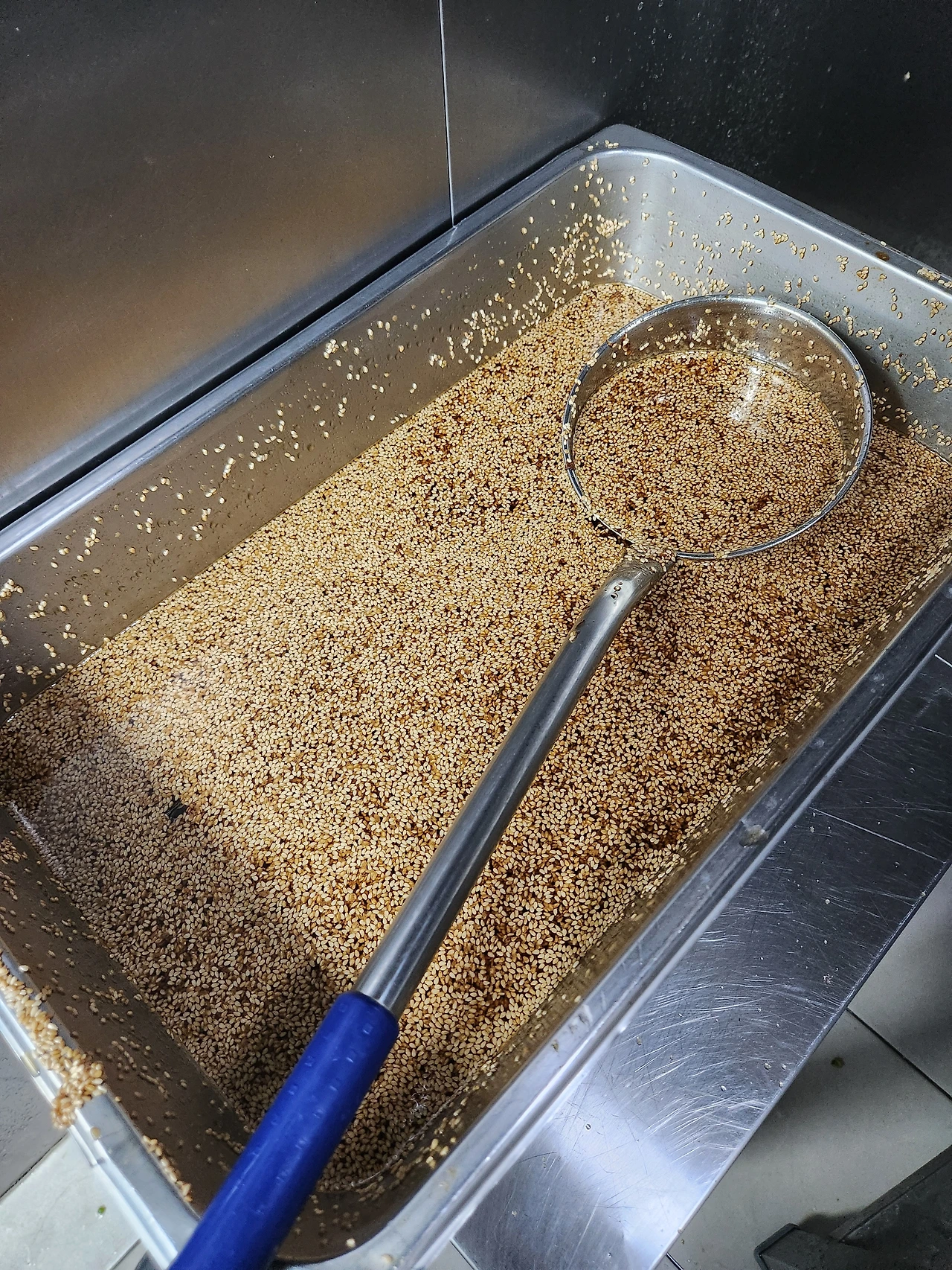 마지막으로 비빔장을 만든다. 2Kg짜리 고추장 4통을 원형 대야에 넣고 통에 붙어있던 잔여 고추장을 떼어내기 위해 물로 헹궈서 붓고, 여기에 매실액, 참기름, 식초, 설탕, 참깨를 뿌려서 골고루 섞어준다. 그런데 솔직히 물의 양을 맞추기가 너무 어려웠다. 배식이 끝나고 양념통이 회수되고 나서야 주위 봉사들에 의해 오늘의 비빔장은 뻑뻑했다는 평을 받았다. 그렇게 내 노하우는 조금씩 쌓여 간다.