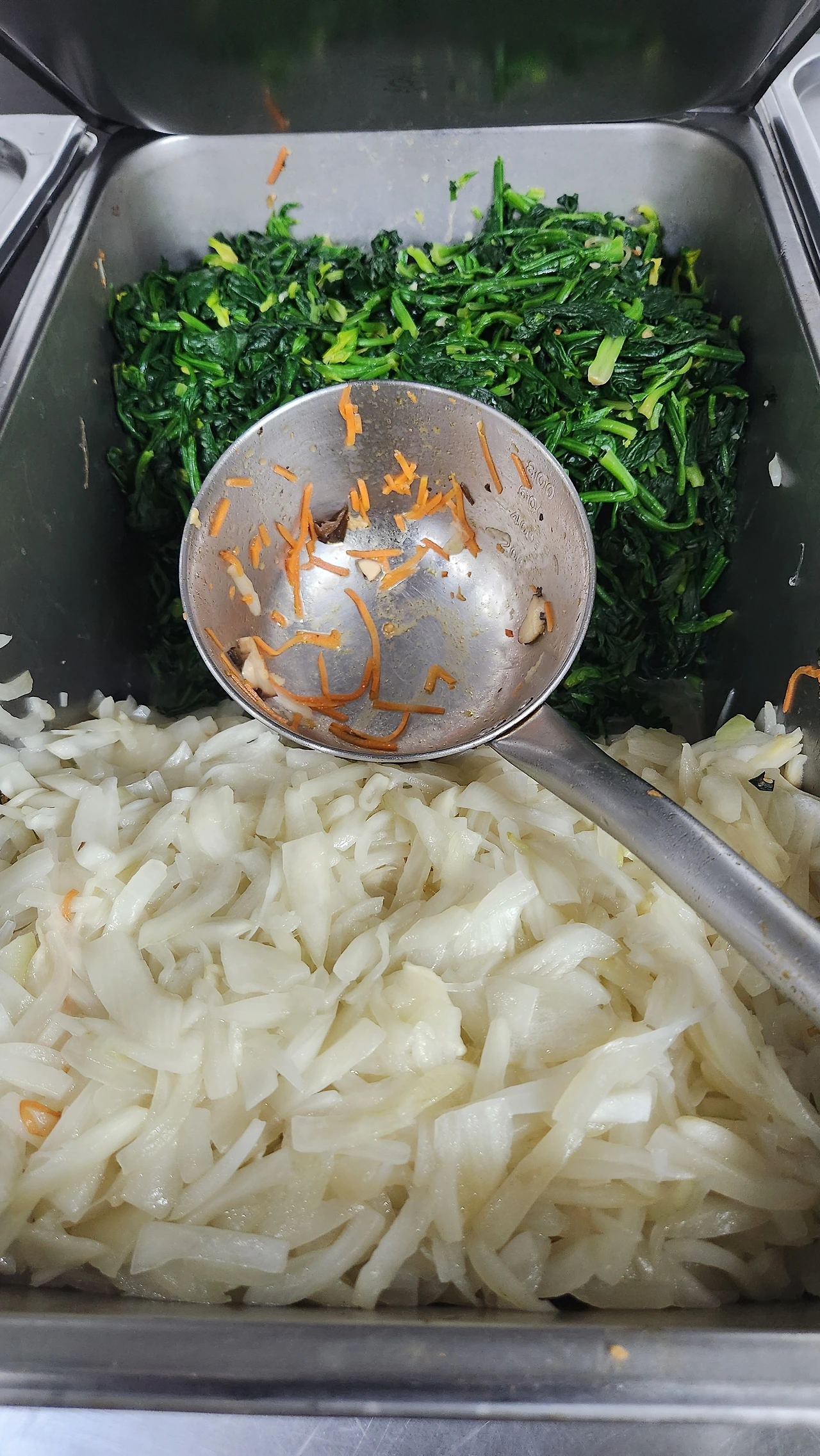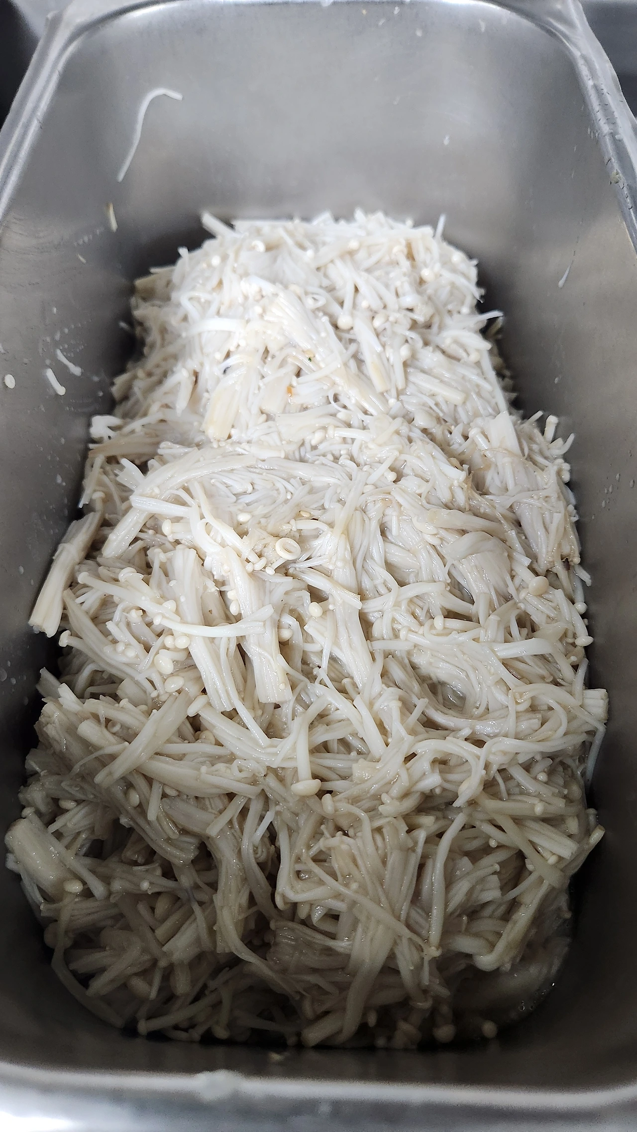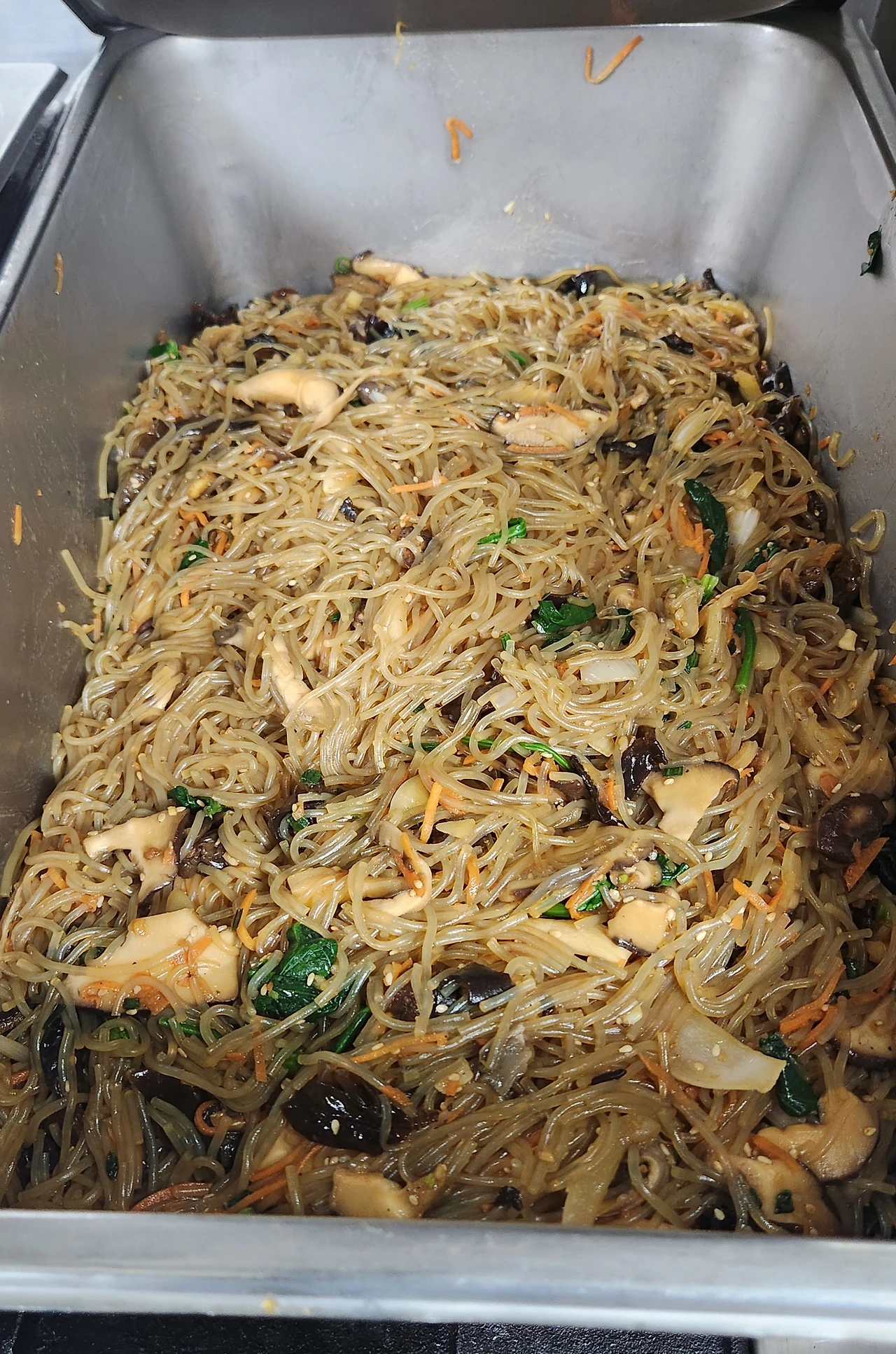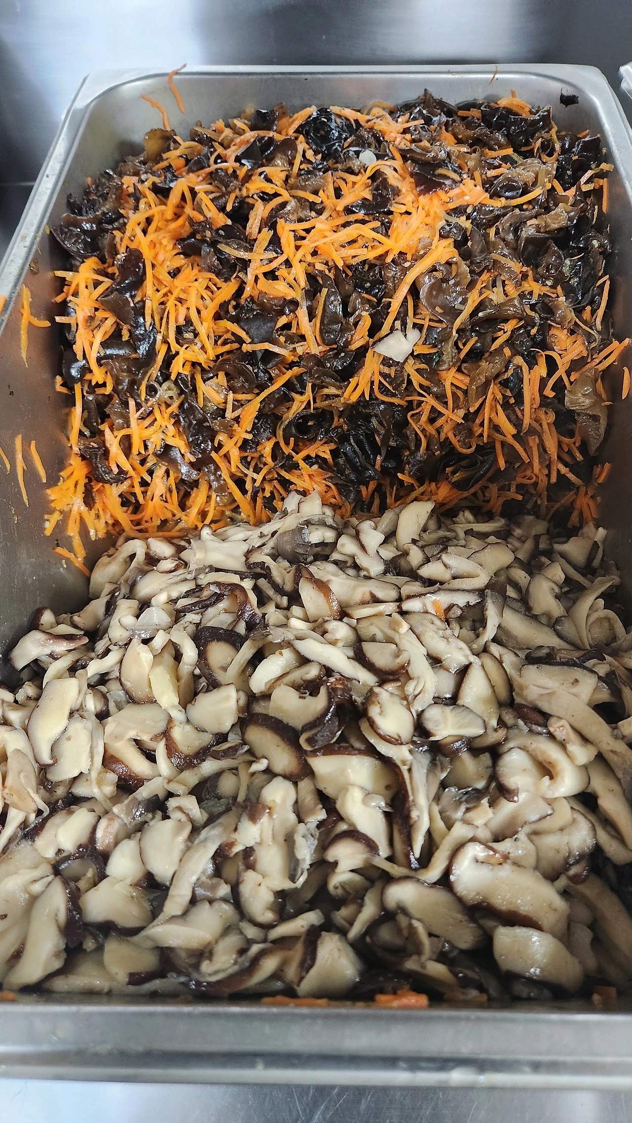 아침부터 조리실이 분주해진다. 잡채 양념소스를 만들기 위해 커다란 사각 바트(용기)에 양조간장을 베이스로 참기름, 설탕, 매실진액, 식초, 다진 마늘을 넣고 참깨와 후추를 뿌려준다. 봉사자의 조언에 따라 쪽파도 추가로 넣어준다. 냉장고에서 전날 손질해 놓은 목이버섯, 시금치, 양파와 느타리버섯을 꺼내고 새벽에 배송된 당면, 표고버섯, 당근채도 챙겨서 테이블 위에 가지런히 올려놓는다.
