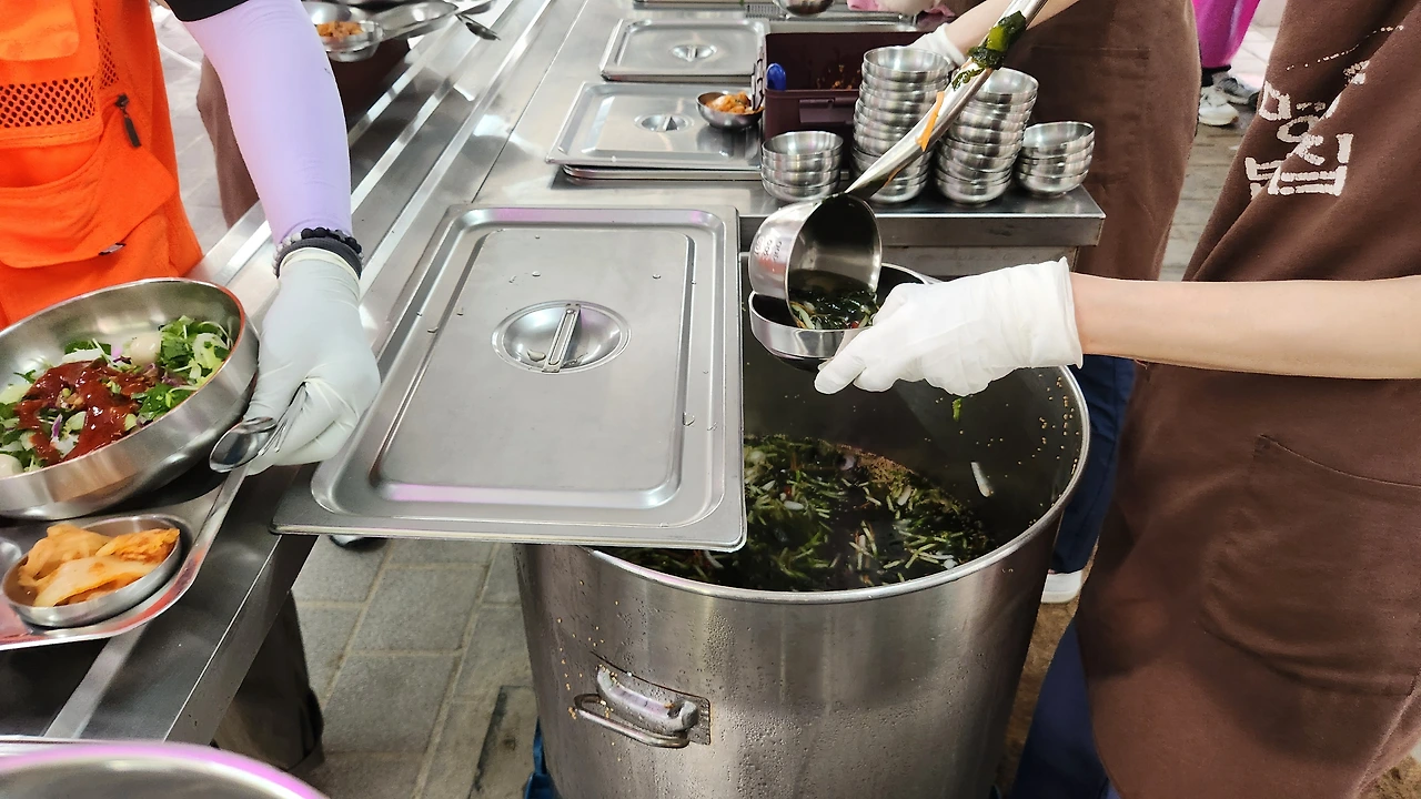 주방에서 국통을 놓고 오이, 미역, 당근, 양파, 청양고추를 차례로 섞는다. 거기에 육수가루, 식초, 설탕, 간장, 까나리액, 소금으로 평소보다 진하게 간을 맞추고 야외천막식당으로 옮긴다. 그곳에서 생수와 얼음을 붓고 참깨로 마무리를 한다. 시원한 냉국이 천명의 더위를 식혀준다.