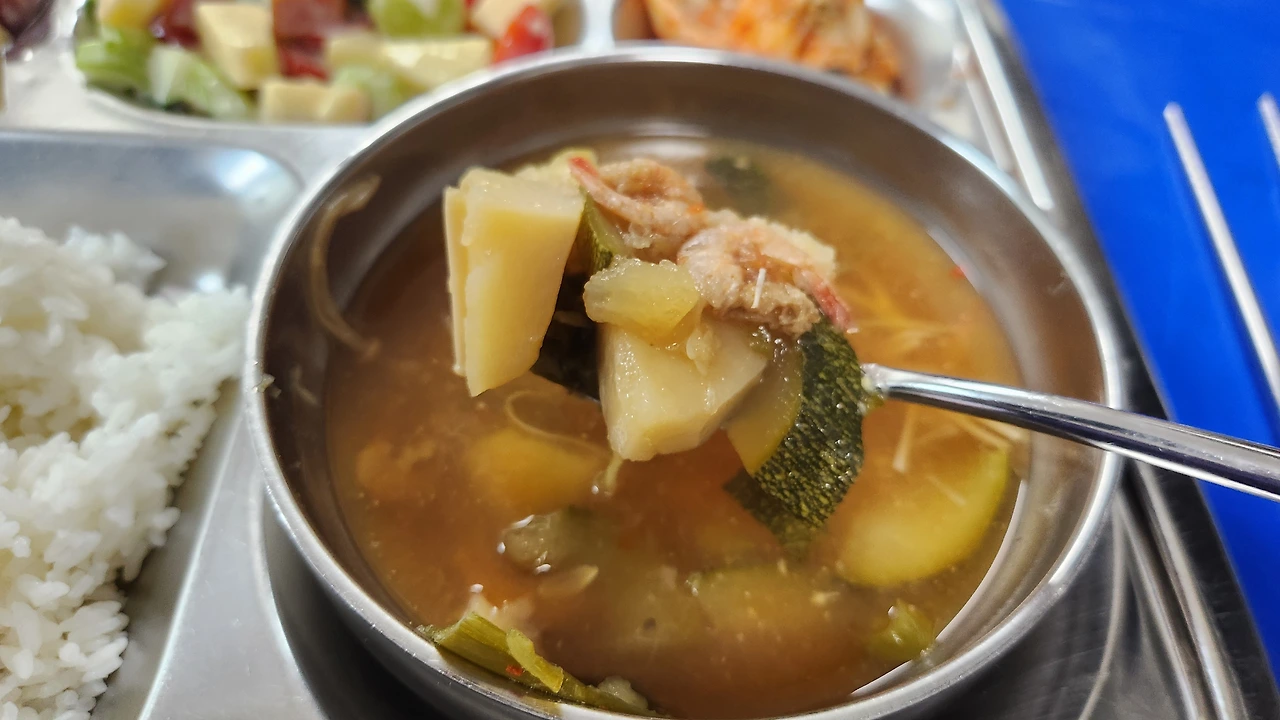 물을 끓이고 국양념과 건새우를 넣고 다시 끓이다가 며칠 전에 물에 재워놓았던 강원도 감자를 국통에 미끄러지듯이 빠뜨려 넣는다. 이어서 조리실에서 배송된 주키니 호박을 넣고 딱딱한 감자가 물컹해질 정도의 시간이 흐르고 나서, 느타리버섯, 양파를 넣고 한 소 뜸 지나서 대파도 마지막으로 넣는다. 감자된장국이 마무리될 무렵에, 봉사자들이 화구 주위를 지나면서 무슨 국이냐고 물어본다.