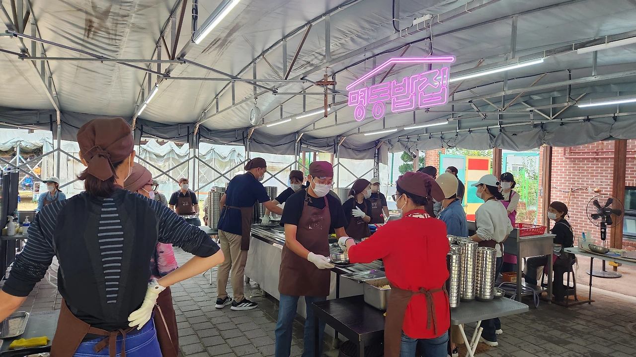 친구들이 봉사활동에 함께했다. 학창 시절에 영어공부를 함께 하던 친구들이다. 시간상으로는 대략 30년을 옆에서 보아 온 오래된 친구들이다. 아직까지는 모두들 현업에서 일을 하고 있다 보니 '일요일 오후 봉사'로 어렵게 시간을 맞췄다. 봉사자 안내 문자에 따라 집합장소에 도착하고, '명동밥집'이라고 인쇄된 앞치마와 두건을 지급받고 '사전교육' 후에 바로 야외식당으로 이동했다.
